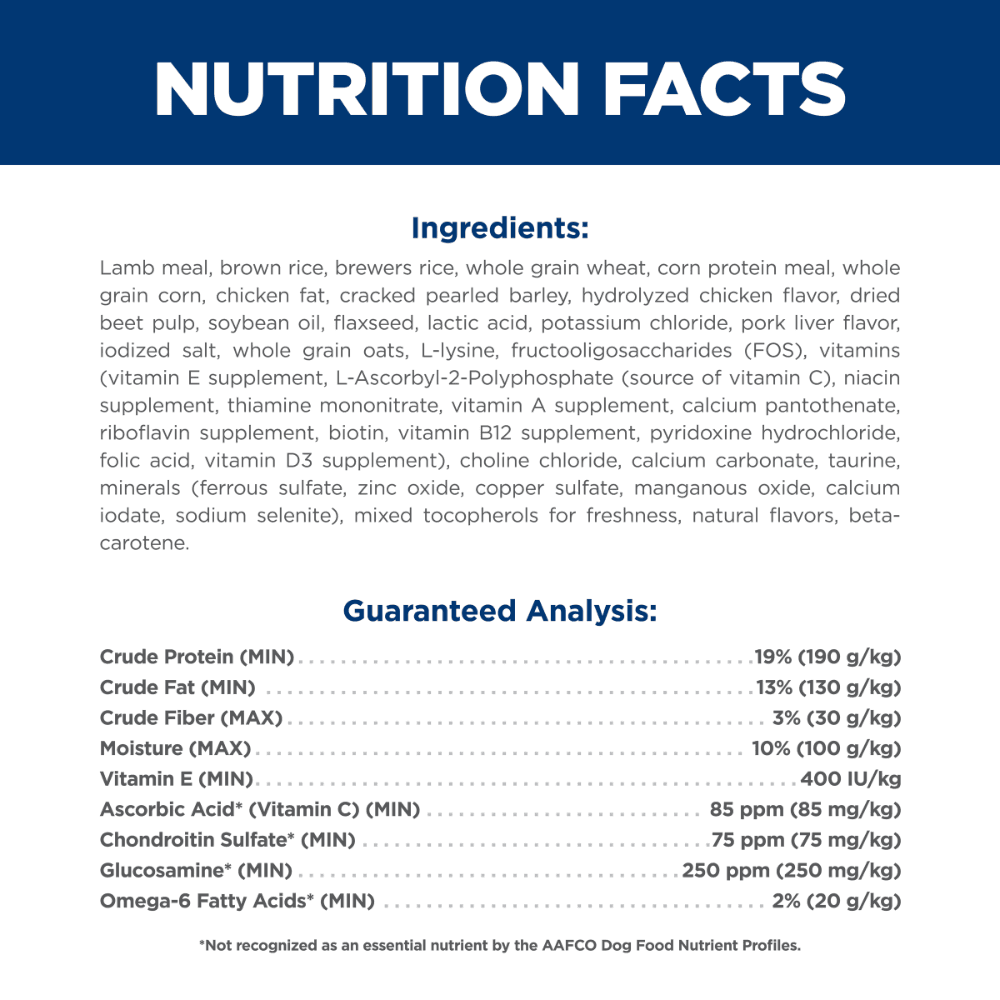 Lamb Meal, Brown Rice, Brewers Rice, Whole Grain Wheat, Corn Protein Meal, Whole Grain Corn, Chicken Fat, Cracked Pearled Barley, Hydrolysed Chicken Flavour, Dried Beet Pulp, Soybean Oil, Flaxseed, Lactic Acid, Potassium Chloride, Pork Liver Flavour, Iodized Salt, Whole Grain Oats, L-Lysine, Fructooligosaccharides (Fos), Vitamins (Vitamin E Supplement, L-Ascorbyl-2-Polyphosphate (Source Of Vitamin C), Niacin Supplement, Thiamine Mononitrate, Vitamin A Supplement, Calcium Pantothenate, Riboflavin Supplement, Biotin, Vitamin B12 Supplement, Pyridoxine Hydrochloride, Folic Acid, Vitamin D3 Supplement), Choline Chloride, Calcium Carbonate, Taurine, Minerals (Ferrous Sulfate, Zinc Oxide, Copper Sulfate, Manganous Oxide, Calcium Iodate, Sodium Selenite), Mixed Tocopherols For Freshness, Natural Flavours, Beta-Carotene