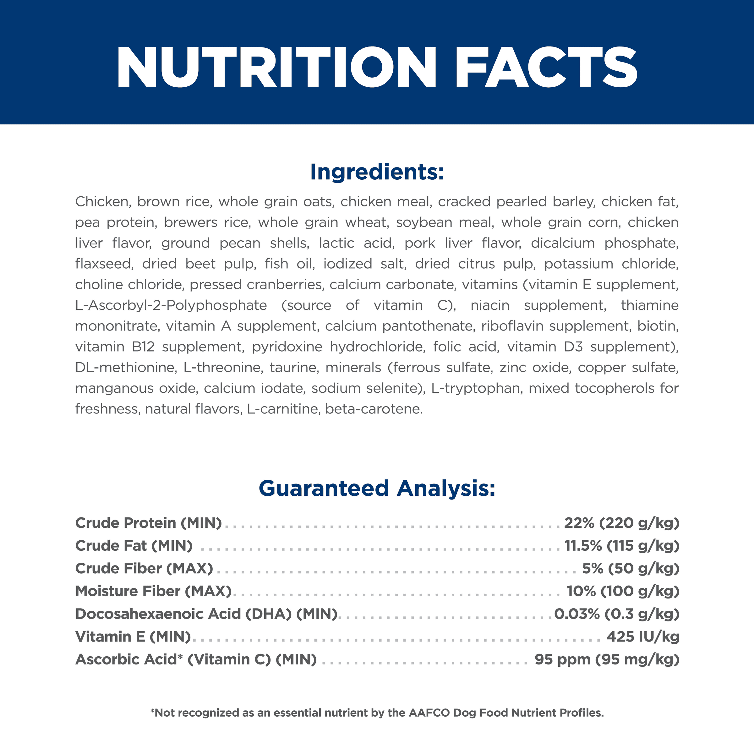 Chicken, Brown Rice, Whole Grain Oats, Chicken Meal, Cracked Pearled Barley, Chicken Fat, Pea Protein, Brewers Rice, Whole Grain Wheat, Soybean Meal, Whole Grain Corn, Chicken Liver Flavour, Ground Pecan Shells, Lactic Acid, Pork Liver Flavour, Dicalcium Phosphate, Flaxseed, Dried Beet Pulp, Fish Oil, Iodized Salt, Dried Citrus Pulp, Potassium Chloride, Choline Chloride, Pressed Cranberries, Calcium Carbonate, Vitamins (Vitamin E Supplement, L-Ascorbyl-2-Polyphosphate (Source Of Vitamin C), Niacin Supplement, Thiamine Mononitrate, Vitamin A Supplement, Calcium Pantothenate, Riboflavin Supplement, Biotin, Vitamin B12 Supplement, Pyridoxine Hydrochloride, Folic Acid, Vitamin D3 Supplement), Dlmethionine, L-Threonine, Taurine, Minerals (Ferrous Sulfate, Zinc Oxide, Copper Sulfate, Manganous Oxide, Calcium Iodate, Sodium Selenite), L-Tryptophan, Mixed Tocopherols For Freshness, Natural Flavours, L-Carnitine, Beta-Carotene