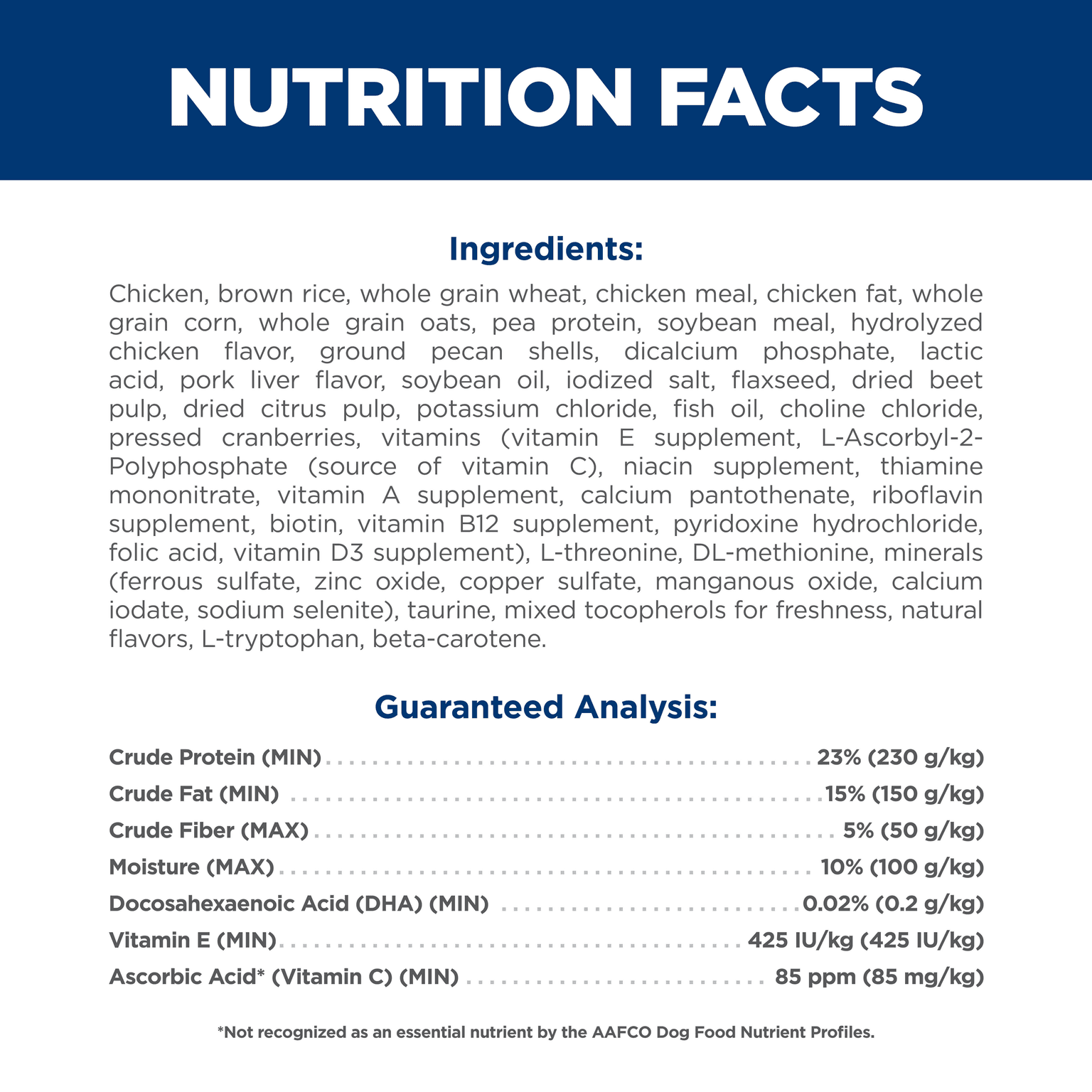 Chicken, Brown Rice, Whole Grain Wheat, Chicken Meal, Chicken Fat, Whole Grain Corn, Whole Grain Oats, Pea Protein, Soybean Meal, Hydrolysed Chicken Flavour, Ground Pecan Shells, Dicalcium Phosphate, Lactic Acid, Pork Liver Flavour, Soybean Oil, Iodized Salt, Flaxseed, Dried Beet Pulp, Dried Citrus Pulp, Potassium Chloride, Fish Oil, Choline Chloride, Pressed Cranberries, Vitamins (Vitamin E Supplement, L-Ascorbyl-2-Polyphosphate (Source Of Vitamin C), Niacin Supplement, Thiamine Mononitrate, Vitamin A Supplement, Calcium Pantothenate, Riboflavin Supplement, Biotin, Vitamin B12 Supplement, Pyridoxine Hydrochloride, Folic Acid, Vitamin D3 Supplement), L-Threonine, Dl-Methionine, Minerals (Ferrous Sulfate, Zinc Oxide, Copper Sulfate, Manganous Oxide, Calcium Iodate, Sodium Selenite), Taurine, Mixed Tocopherols For Freshness, Natural Flavours, L-Tryptophan, Beta-Carotene