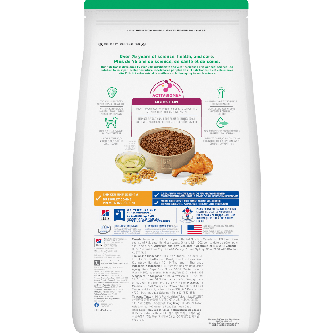 Hill's Science Diet Puppy Small Bites Dry Dog Food provides precisely balanced nutrition to support the essential building blocks for your puppy's lifelong health. This formula is crafted with vital nutrients in a delicious, small kibble to give your growing dog the best start in life and help them reach their full potential.