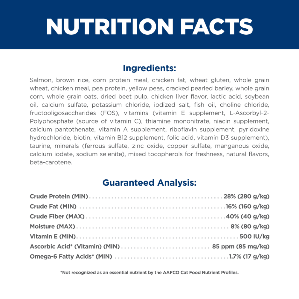 Salmon, Brown Rice, Corn Protein Meal, Chicken Fat, Wheat Gluten, Whole Grain Wheat, Chicken Meal, Pea Protein, Yellow Peas, Cracked Pearled Barley, Whole Grain Corn, Whole Grain Oats, Dried Beet Pulp, Chicken Liver Flavor, Lactic Acid, Soybean Oil, Calcium Sulfate, Potassium Chloride, Iodized Salt, Fish Oil, Choline Chloride, Fructooligosaccharides (FOS), vitamins (Vitamin E Supplement, L-Ascorbyl-2-Polyphosphate (source of Vitamin C), Thiamine Mononitrate, Niacin Supplement, Calcium Pantothenate, Vitamin A Supplement, Riboflavin Supplement, Pyridoxine Hydrochloride, Biotin, Vitamin B12 Supplement, Folic Acid, Vitamin D3 Supplement), Taurine, minerals (Ferrous Sulfate, Zinc Oxide, Copper Sulfate, Manganous Oxide, Calcium Iodate, Sodium Selenite), Mixed Tocopherols for freshness, Natural Flavors, Beta-Carotene.
