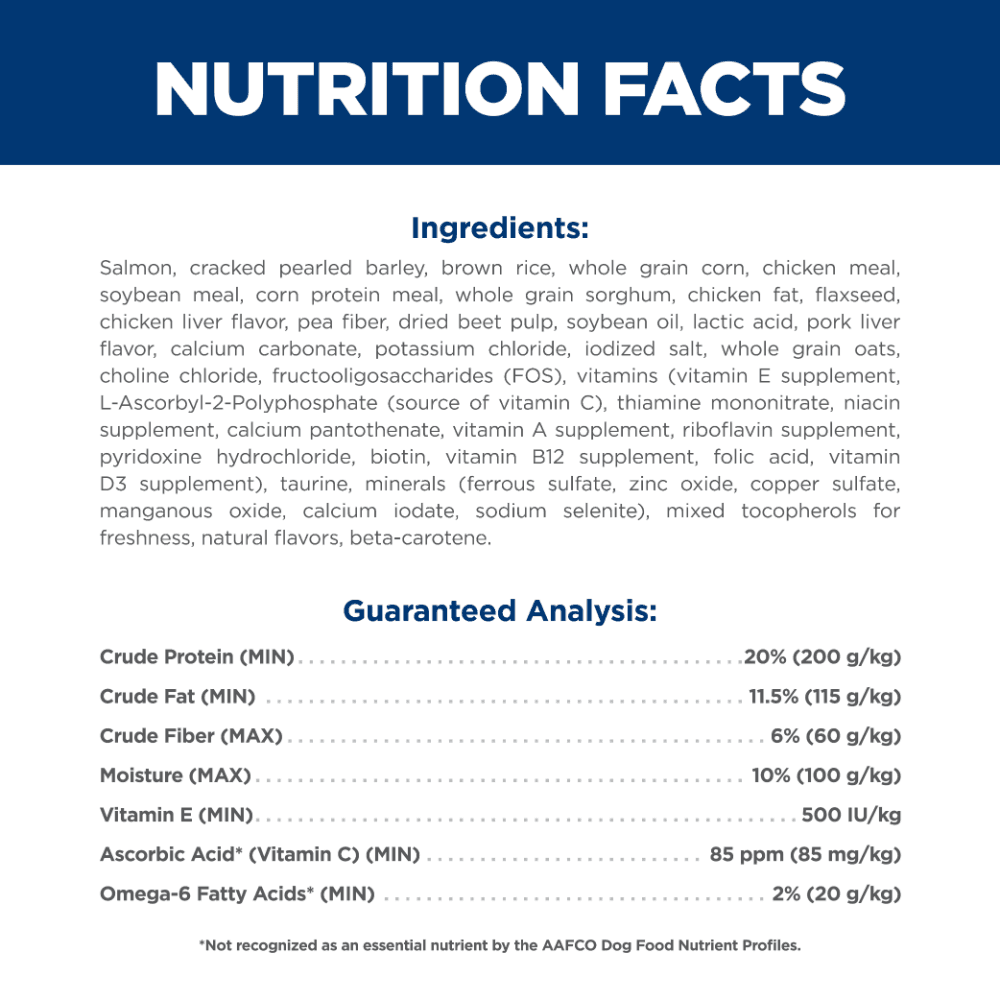 Salmon, Cracked Pearled Barley, Brown Rice, Whole Grain Corn, Chicken Meal, Soybean Meal, Corn Protein Meal, Whole Grain Sorghum, Chicken Fat, Flaxseed, Chicken Liver Flavor, Pea Fiber, Dried Beet Pulp, Soybean Oil, Lactic Acid, Pork Liver Flavor, Calcium Carbonate, Potassium Chloride, Iodized Salt, Whole Grain Oats, Choline Chloride, Fructooligosaccharides (FOS), vitamins (Vitamin E Supplement, LAscorbyl-2-Polyphosphate (source of Vitamin C), Thiamine Mononitrate, Niacin Supplement, Calcium Pantothenate, Vitamin A Supplement, Riboflavin Supplement, Pyridoxine Hydrochloride, Biotin, Vitamin B12 Supplement, Folic Acid, Vitamin D3 Supplement), Taurine, minerals (Ferrous Sulfate, Zinc Oxide, Copper Sulfate, Manganous Oxide, Calcium Iodate, Sodium Selenite), Mixed Tocopherols for freshness, Natural Flavors, Beta-Carotene.