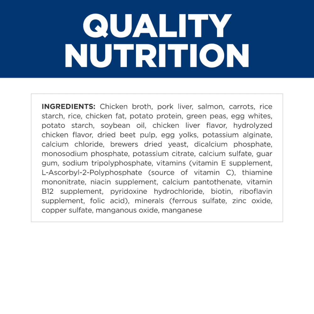 Chicken Broth, Pork Liver, Salmon, Carrots, Rice Starch, Rice, Chicken Fat, Potato Protein, Green Peas, Egg Whites, Potato Starch, Soybean Oil, Chicken Liver Flavor, Hydrolyzed Chicken Flavor, Dried Beet Pulp, Egg Yolks, Potassium Alginate, Calcium Chloride, Brewers Dried Yeast, Dicalcium Phosphate, Monosodium Phosphate, Potassium Citrate, Calcium Sulfate, Guar Gum, Sodium Tripolyphosphate, vitamins (Vitamin E Supplement, L-Ascorbyl-2-Polyphosphate (source of Vitamin C), Thiamine Mononitrate, Niacin Supplement, Calcium Pantothenate, Vitamin B12 Supplement, Pyridoxine Hydrochloride, Biotin, Riboflavin Supplement, Folic Acid), minerals (Ferrous Sulfate, Zinc Oxide, Copper Sulfate, Manganous Oxide, Manganese Sulfate, Calcium Iodate, Sodium Selenite), Choline Chloride, Taurine, Magnesium Oxide, Thiamine Hydrochloride, Calcium Carbonate