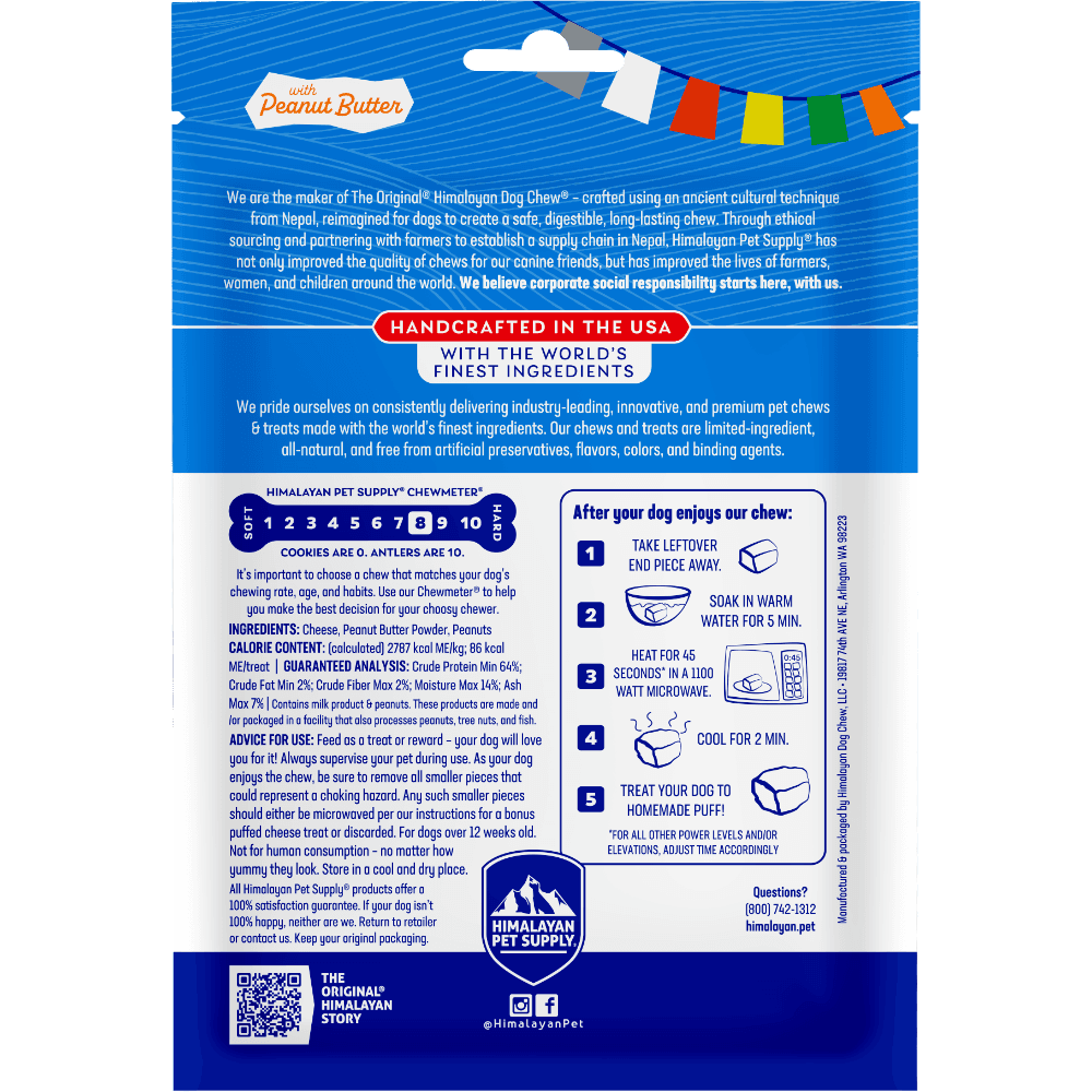 Himalayan Dog Chews Peanut Butter Dog Chew is a long-lasting, naturally smoked hard cheese treat with added peanut butter flavour. Made with ethically sourced ingredients, this chew is perfect for dogs that love a satisfying and flavourful snack.