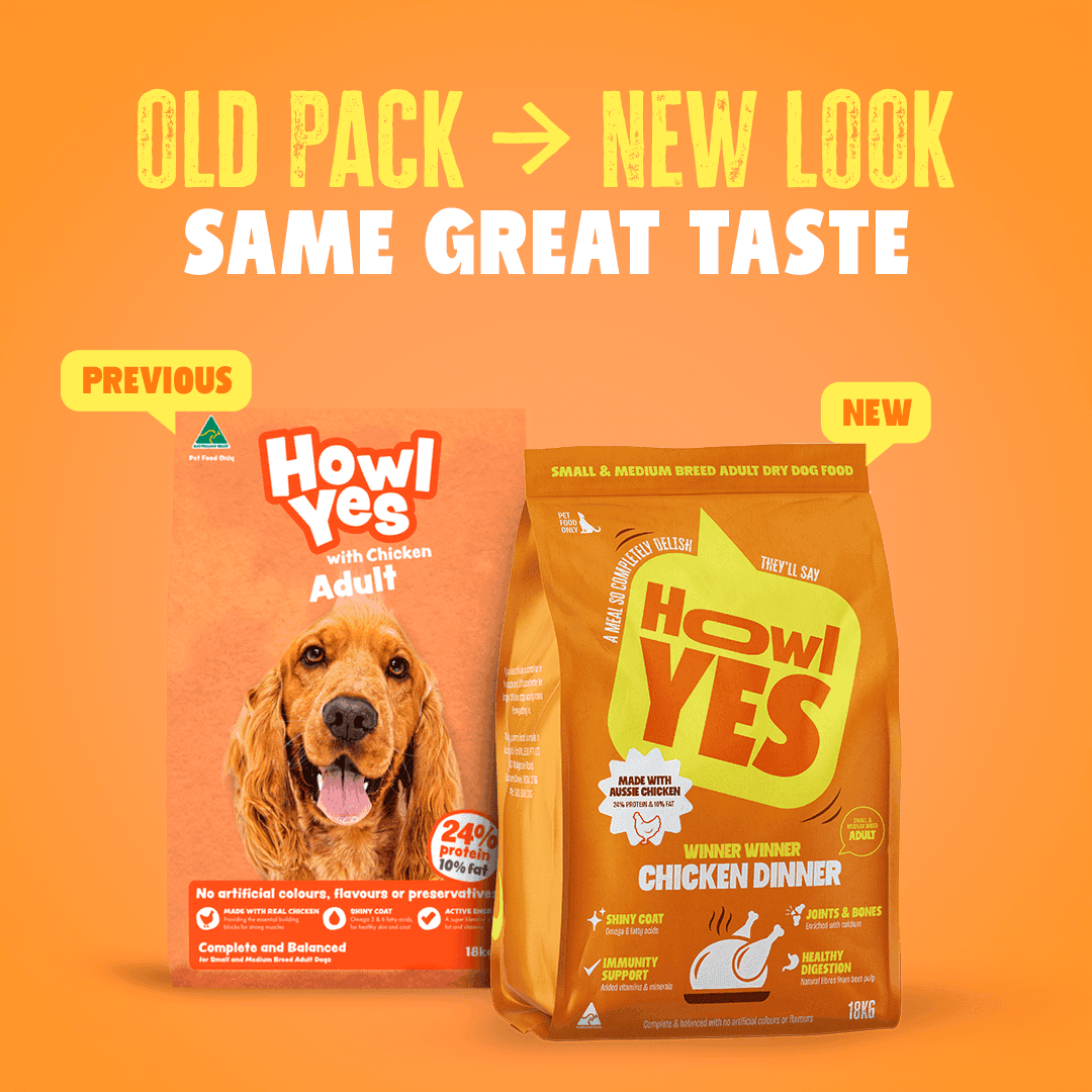 Howl Yes Chicken Dinner Small to Medium Adult Dog Food Winner Winner Chicken Dinner! A meal so completely delish, your dog will say HOWL YES. Dry dog food made with Aussie chicken and formulated to give small to medium breed adult dogs the energy they need and keep em heckin happy.