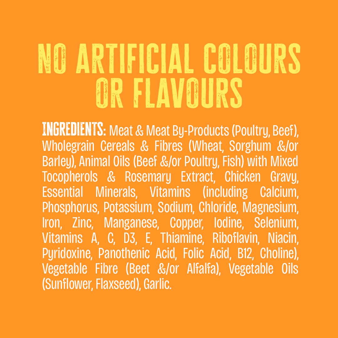 Meat & Meat By-Products (Chicken, Beef, &/Or Lamb) And/Or Poultry By-Products, Wholegrain Wheat, Wholegrain Barley &/Or Corn &/Or Sorghum, Cereal By-Products And/Or Vegetable Proteins, Fats & Oils (From Beef, Lamb, Fish, Poultry &/Or Vegetable), Chicken Gravy, Beet Pulp, Salt, Minerals (Calcium, Phosphorus, Potassium, Copper, Iodine, Manganese, Magnesium, Selenium, Zinc), Beet Pulp, Vitamins (A, C, D3, E, B1, B2, B3, B5, B6, B9, B12 & Choline), Natural Antioxidants With Rosemary Extract, Garlic.