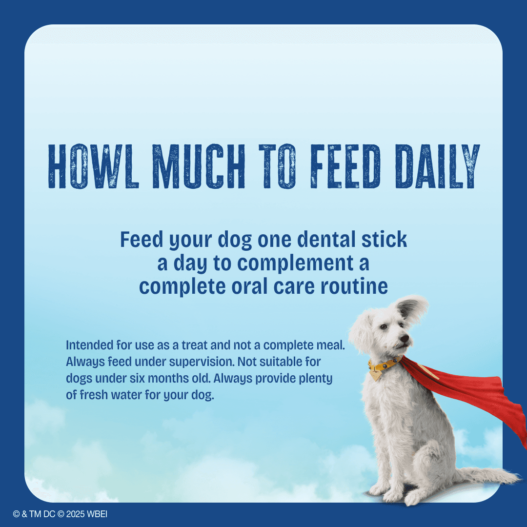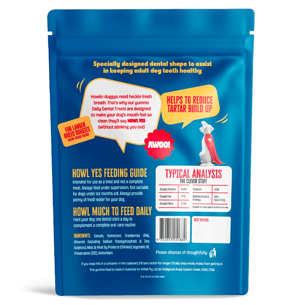 Introducing Howl Yes Power Dental Sticks with Cranberries - inspired by Krypto the Superdog from the new "SUPERMAN" movie, DC Studios' first feature film to hit the big screen in cinemas! These aren't your average treats - they're power snacks for medium to large sidekicks. Designed with a unique shape, they help clean your dog's heroic grin as they chew, and are packed with a punch of antioxidant-rich, superfood Cranberries for immune support. Made in Australia with real chicken, they're the perfect treat for your furry crime-fighter. Howl Yes is saving the world from bad doggo breath - one stick at a time!