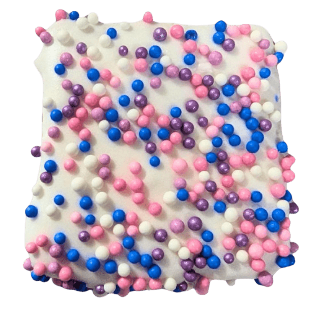 - The pack contains three uniquely decorated cookies: one with “CHAMP,” one with “I HEART U,” and one topped with colourful sprinkles for variety and fun