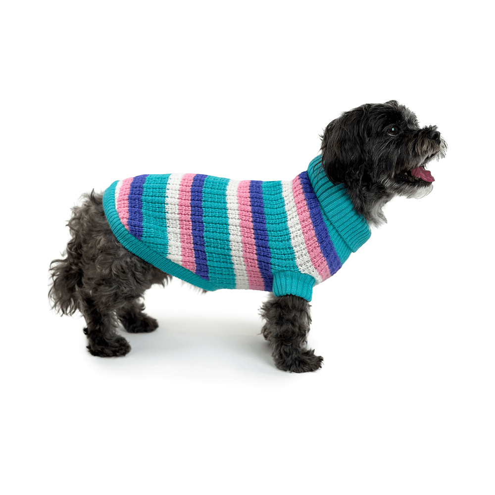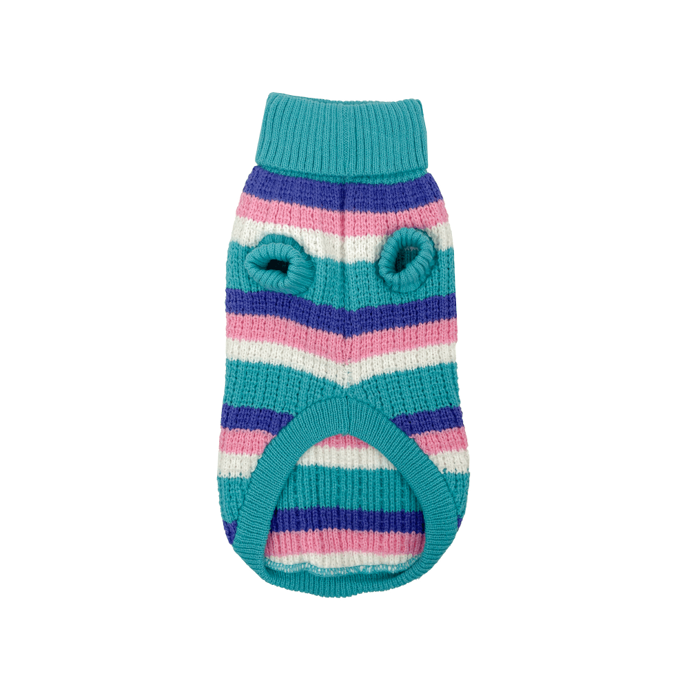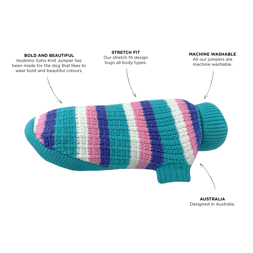 The Huskimo Soho Knit Cyan Crush Dog Jumper is a stylish and functional layering piece designed to keep your canine companion warm during cooler weather. Featuring a vibrant multi-coloured stripe pattern, this knitwear offers a modern aesthetic that balances flair with everyday comfort for your pet.