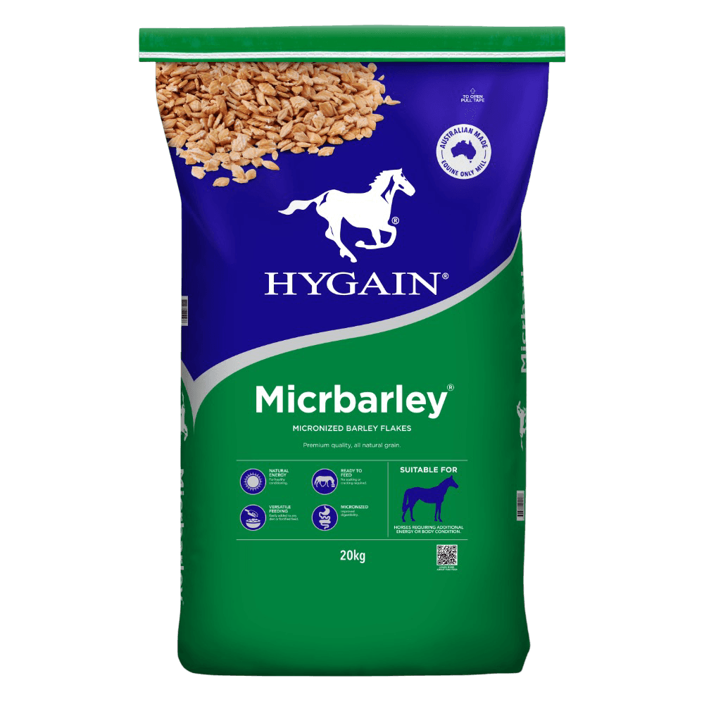 Hygain Micrbarley is a premium quality, all-natural **micronized grain** that offers exceptional digestibility and improved feed efficiency for your horse! This easy-to-feed barley doesnt require soaking or cracking and is meticulously processed to significantly reduce the risk of colic and acidosis, providing a safe and readily absorbed energy source.