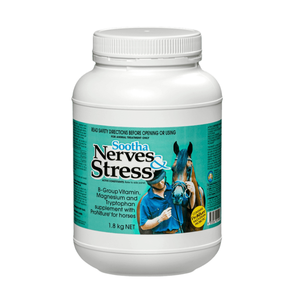 If your horse hits the roof at the first sign of a float trip or turns into a bundle of nerves on a high-grain, low-roughage diet, Sootha Nerves & Stress is the answer. This potent powder delivers a high dose of B-group vitamins, magnesium and L-tryptophan to support mood and curb hyperactivity. Together with PRON8TURE® live cultures, it also restores the healthy gut microflora disrupted by stress, stabilising digestion and helping your horse stay calm from stable to saddle.