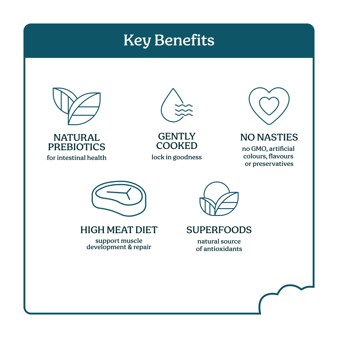 - High in protein from grass-fed beef and wild-caught Hoki to support muscle development and repair