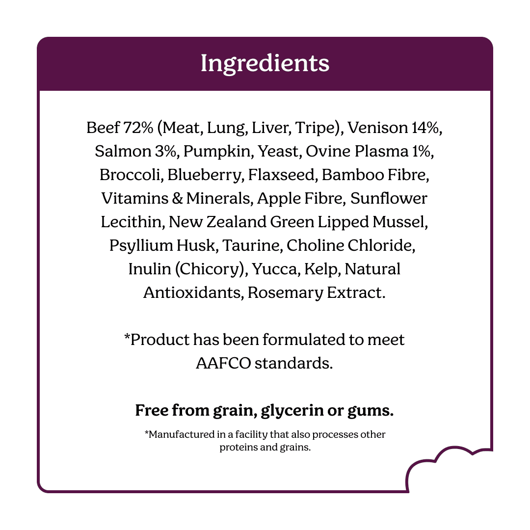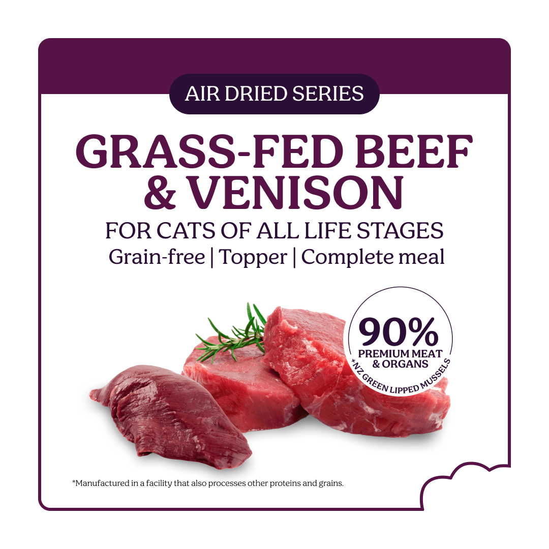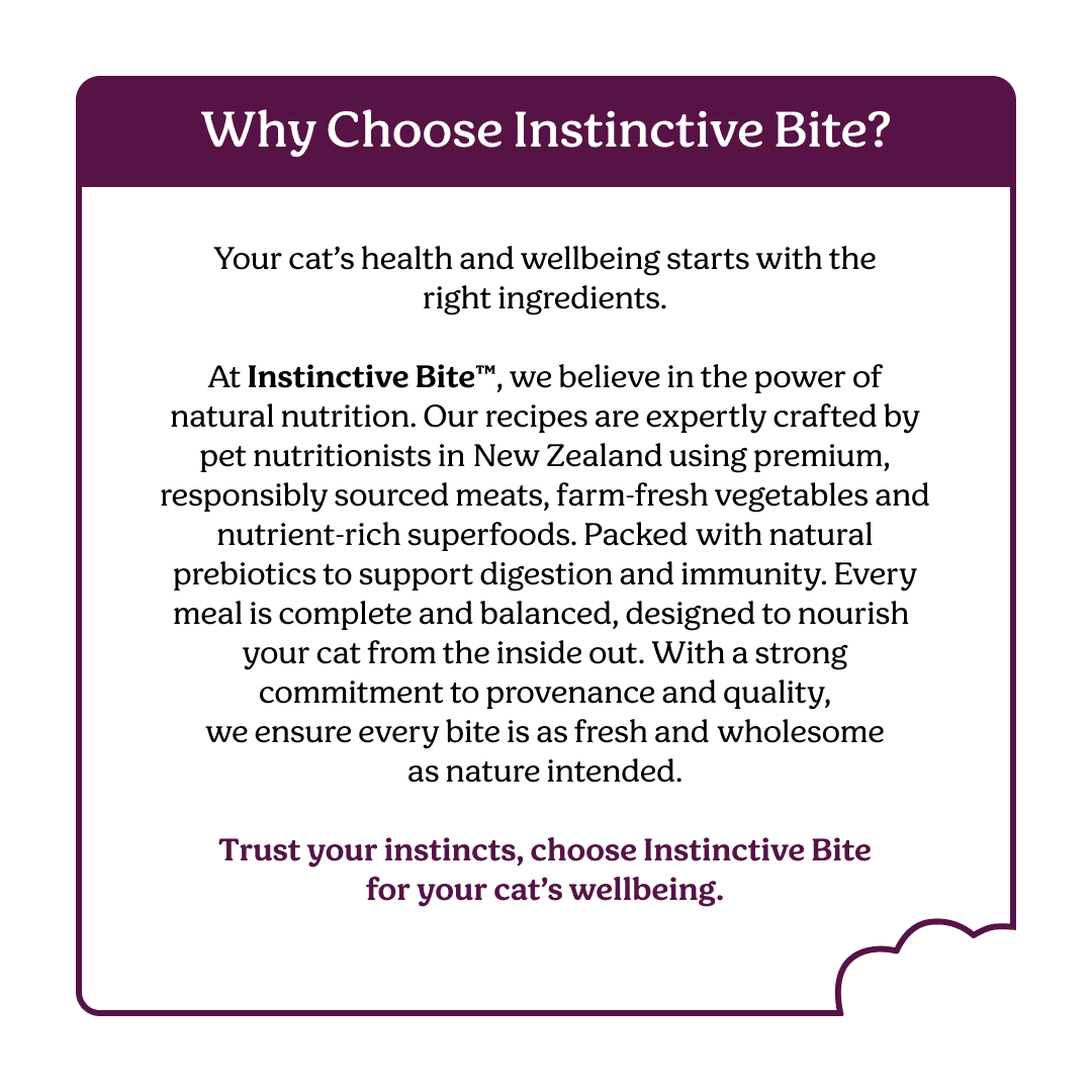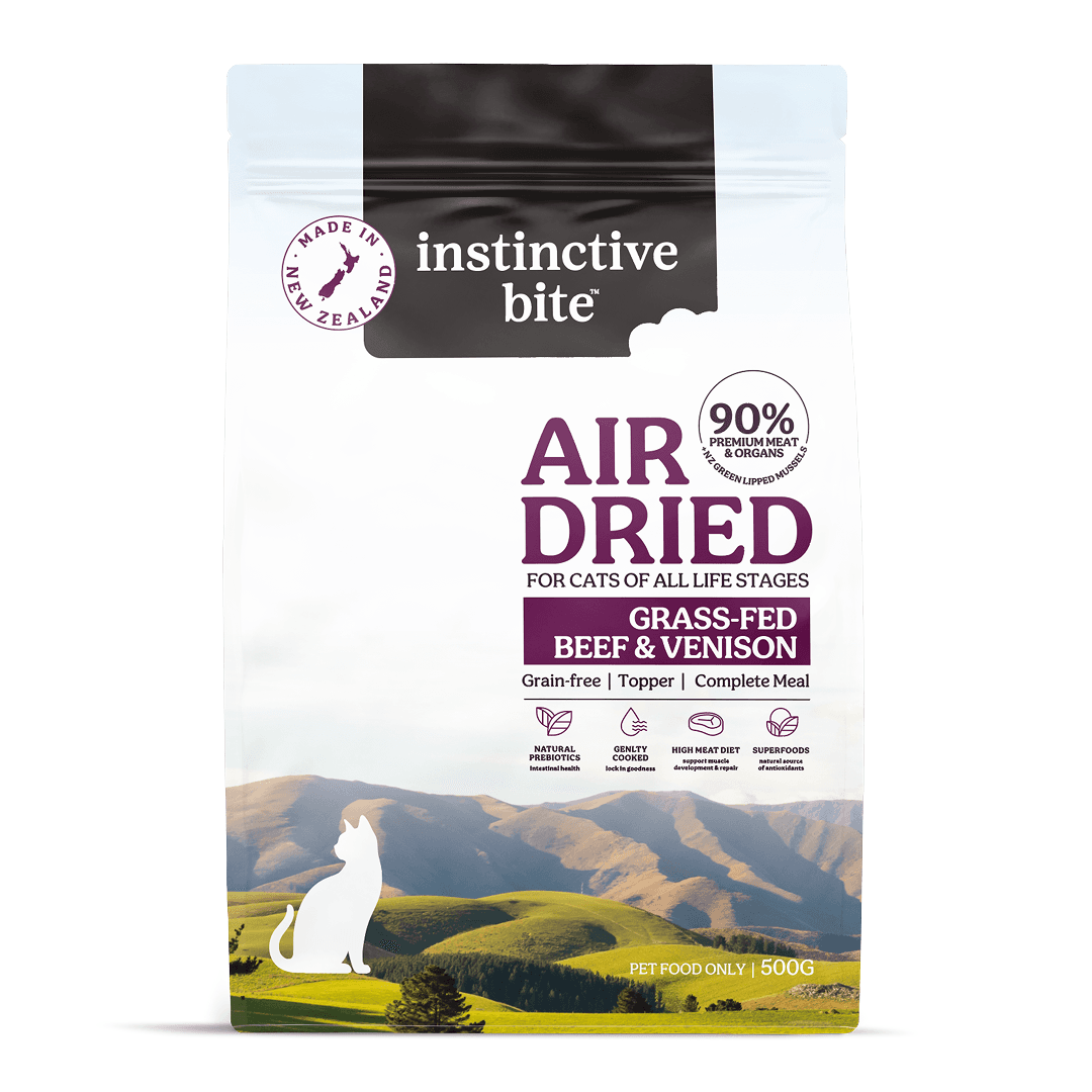 Instinctive Bite Beef & Venison Air-Dried Cat Food recipe is a premium, high-meat recipe made in New Zealand with grass-fed, free-range beef and venison. Containing 90% meat, organs, and seafood, this nutrient-dense, whole-prey inspired diet delivers essential protein, iron, and B vitamins to support lean muscle, energy metabolism, and immune health. Gently air-dried to preserve nutrients and enhance palatability, it's a complete and balanced meal suitable for adult cats of all breeds and life stages. At Instinctive Bite, we believe that a natural and holistic diet ensures that you’re giving your pet the quality they deserve. Supercharged by nature our unique recipe of meats, superfoods, vegetables and natural prebiotics will keep your pet coming back for more.