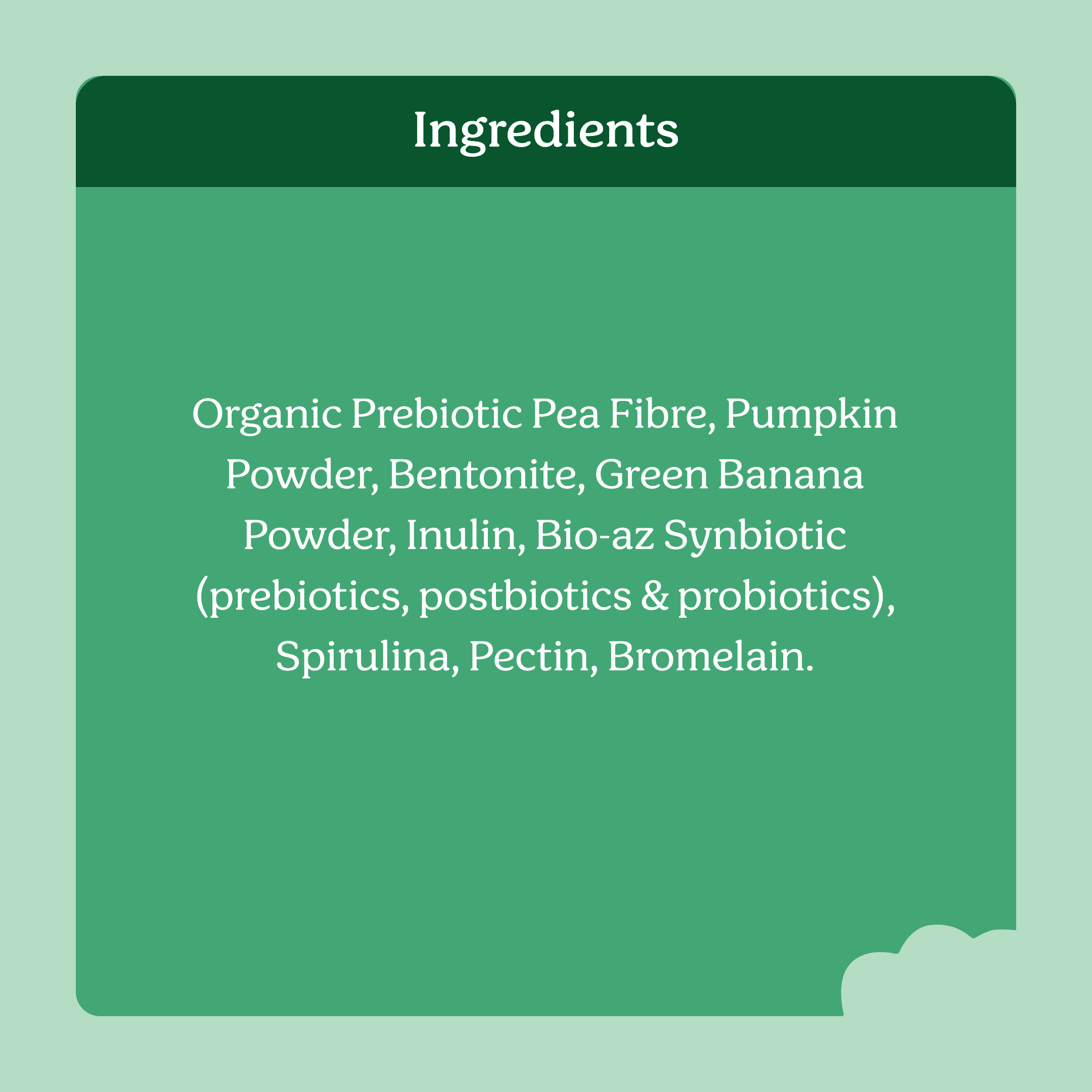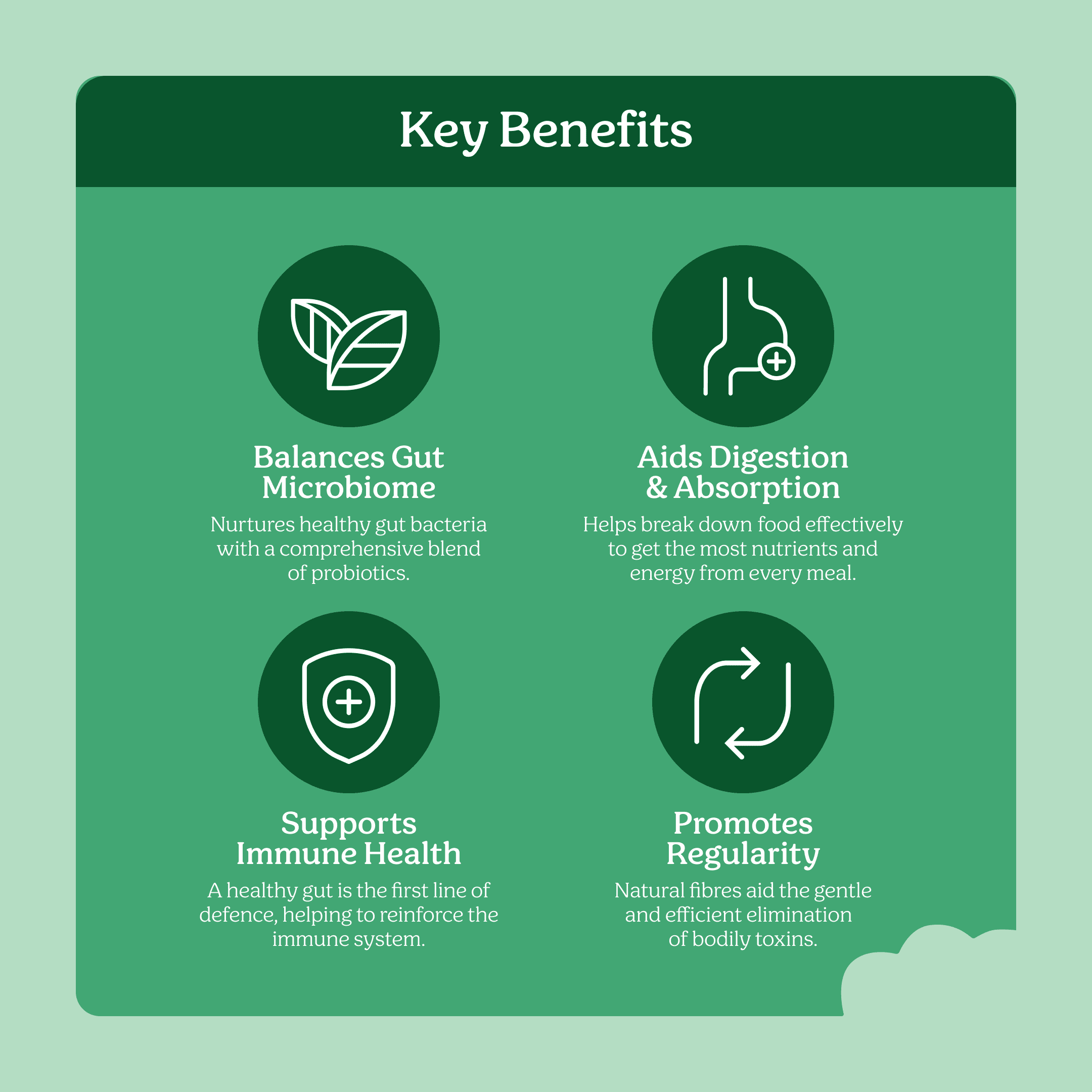 - Promotes a balanced gut microbiome through targeted prebiotic fibres and probiotics