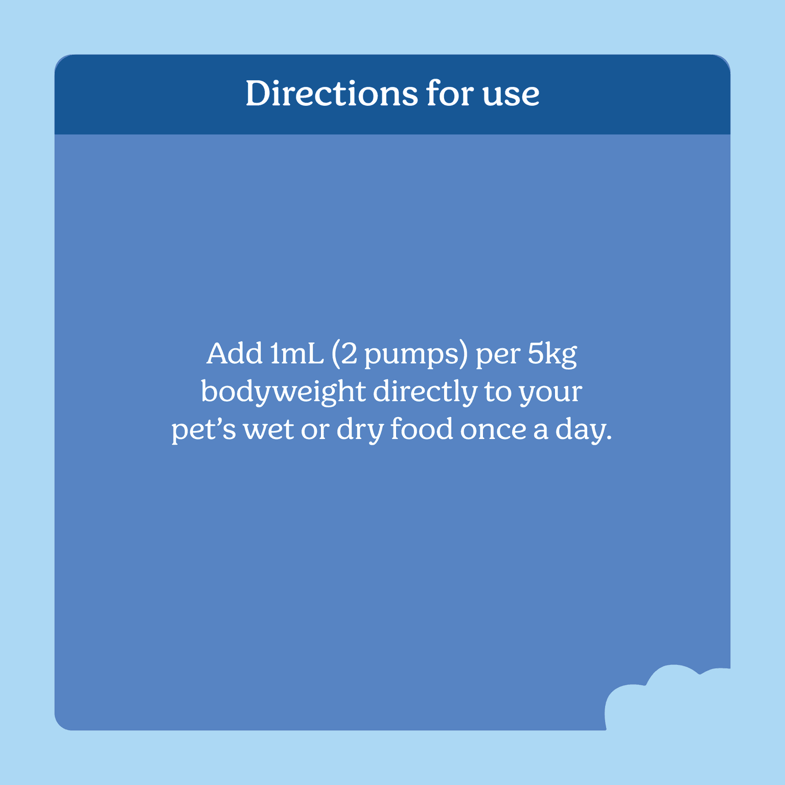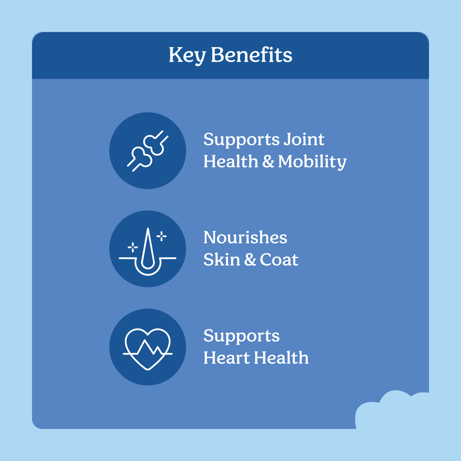 - Supports healthy skin, shiny coat, cognitive function, and joint mobility