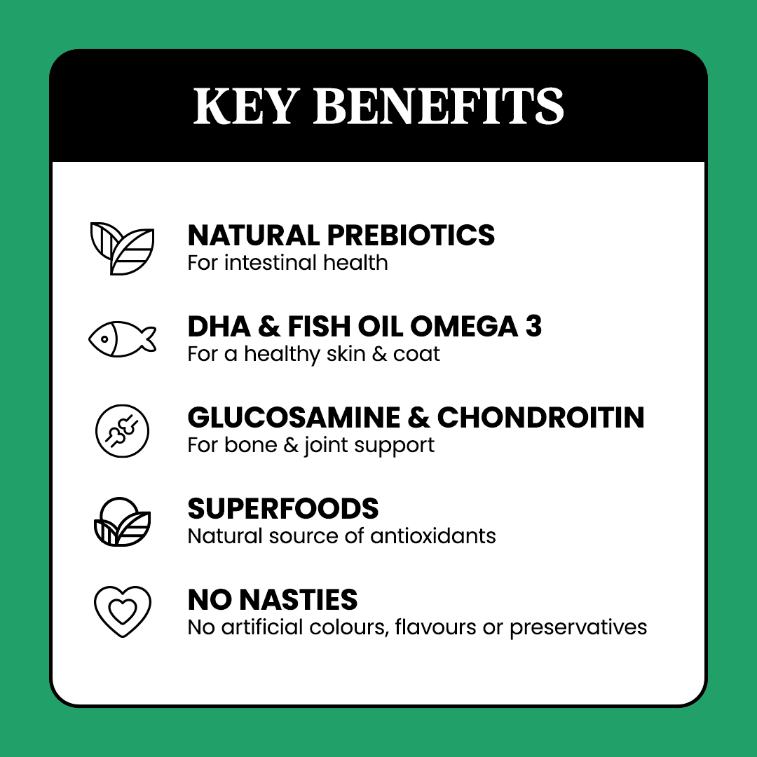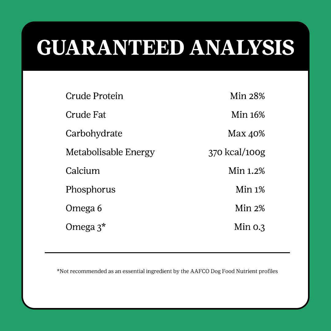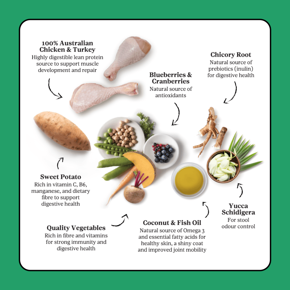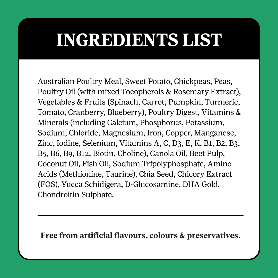 Australian Poultry Meal, Sweet Potato, Chickpeas, Peas, Poultry Oil (With Mixed Tocopherols & Rosemary Extract), Vegetables & Fruits (Spinach, Carrot, Pumpkin, Turmeric, Tomato, Cranberry, Blueberry), Poultry Digest, Vitamins & Minerals (Including Calcium, Phosphorus, Potassium, Sodium, Chloride, Magnesium, Iron, Copper, Manganese, Zinc, Iodine, Selenium, Vitamins A, C, D3, E, K, B1, B2, B3, B5, B6, B9, B12, Biotin, Choline), Canola Oil, Beet Pulp, Coconut Oil, Fish Oil, Sodium Tripolyphosphate, Amino Acids (Methionine, Taurine), Chia Seed, Chicory Extract (Fos), Yucca Schidigera, D-Glucosamine, Dha Gold, Chondroitin Sulphate.