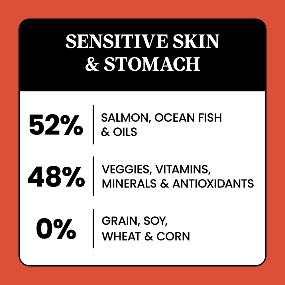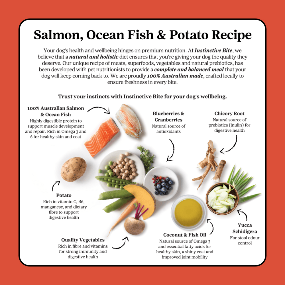 Instinctive Bite Grain Free Salmon, Ocean Fish & Potato Dry Dog Food for Sensitive Skin & Stomach is a specially formulated diet developed with pet nutritionists to provide a complete and balanced meal for dogs with sensitive skin and stomachs. Your dog will love this delicious salmon, ocean fish & potato grain free recipe loaded with natural prebiotics and DHA & fish oil to promote optimal digestive health and a healthy skin and coat. It is also a chicken free recipe which is great for dogs with sensitivities.