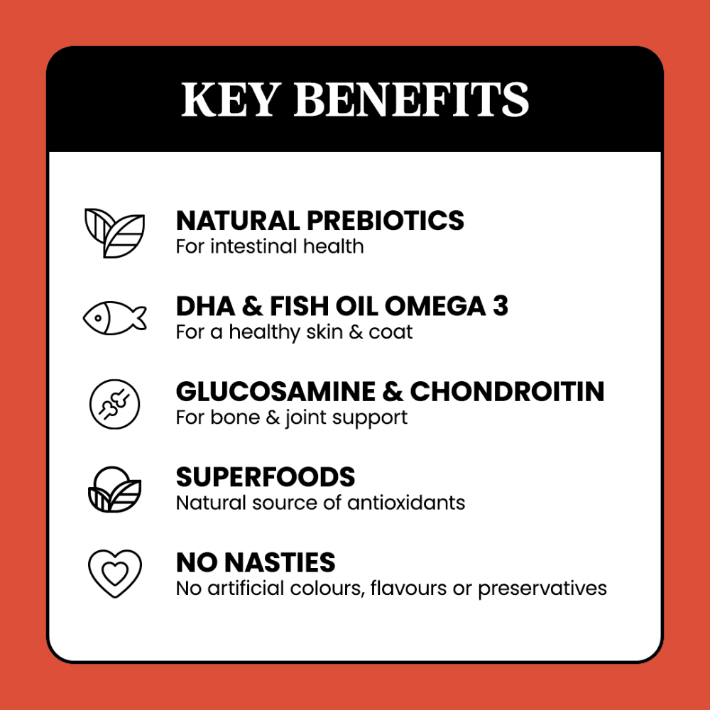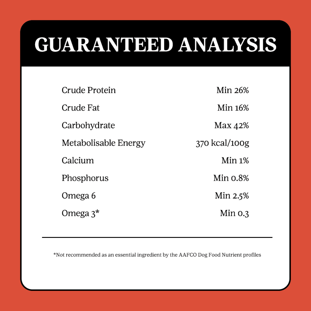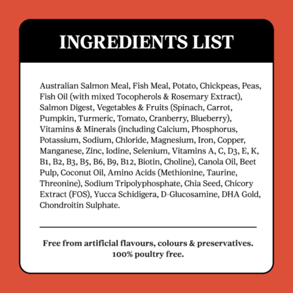 Australian Salmon Meal, Fish Meal, Potato, Chickpeas, Peas, Fish Oil (With Mixed Tocopherols & Rosemary Extract), Salmon Digest, Vegetables & Fruits (Spinach, Carrot, Pumpkin, Turmeric, Tomato, Cranberry, Blueberry), Vitamins & Minerals (Including Calcium, Phosphorus, Potassium, Sodium, Chloride, Magnesium, Iron, Copper, Manganese, Zinc, Iodine, Selenium, Vitamins A, C, D3, E, K, B1, B2, B3, B5, B6, B9, B12, Biotin, Choline), Canola Oil, Beet Pulp, Coconut Oil, Amino Acids (Methionine, Taurine, Threonine), Sodium Tripolyphosphate, Chia Seed, Chicory Extract (Fos), Yucca Schidigera, D-Glucosamine, Dha Gold, Chondroitin Sulphate.