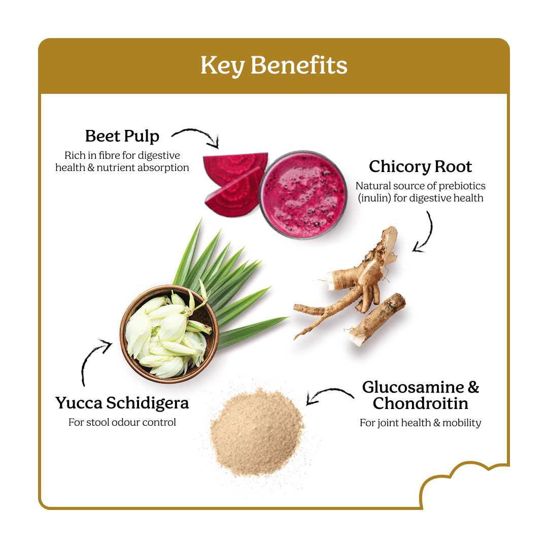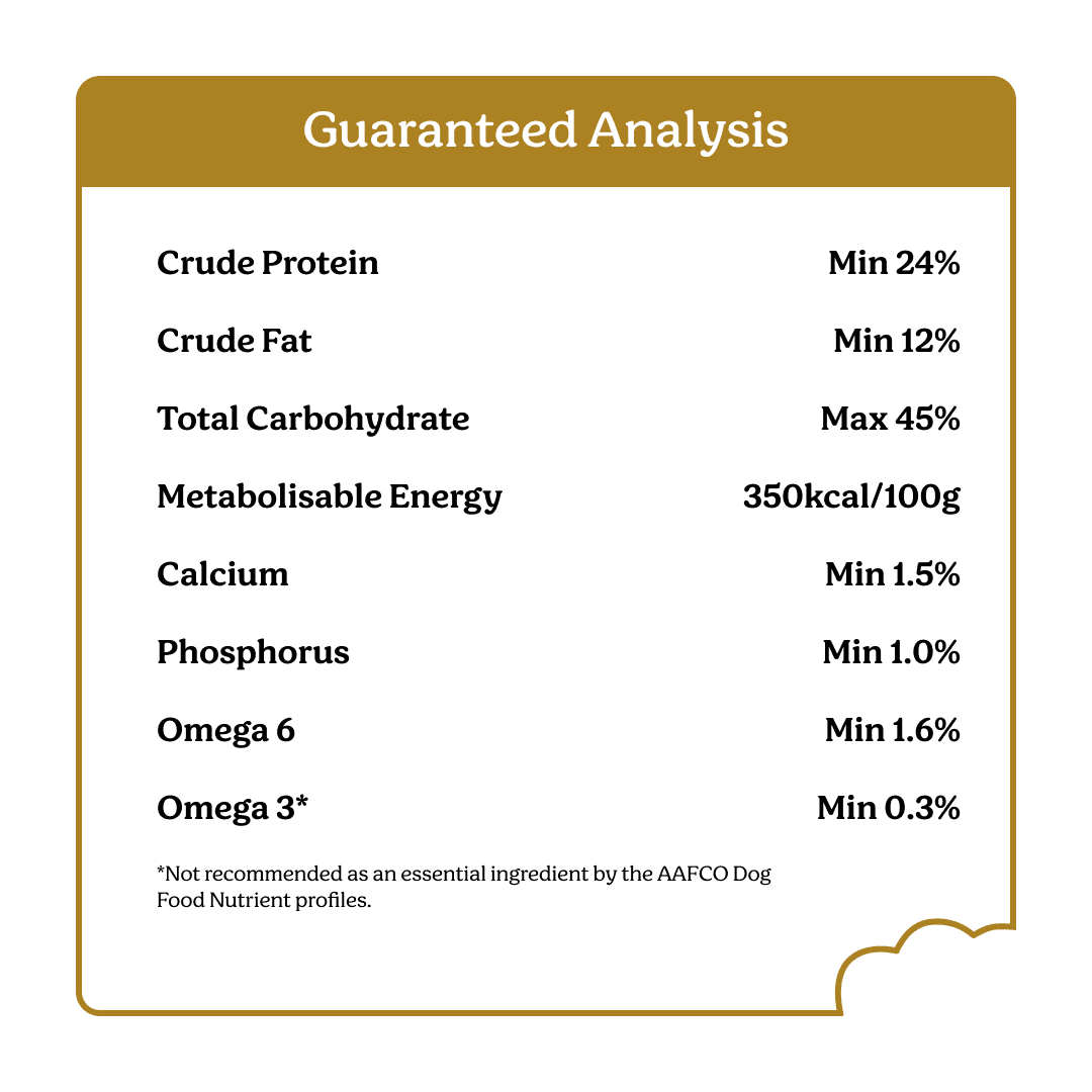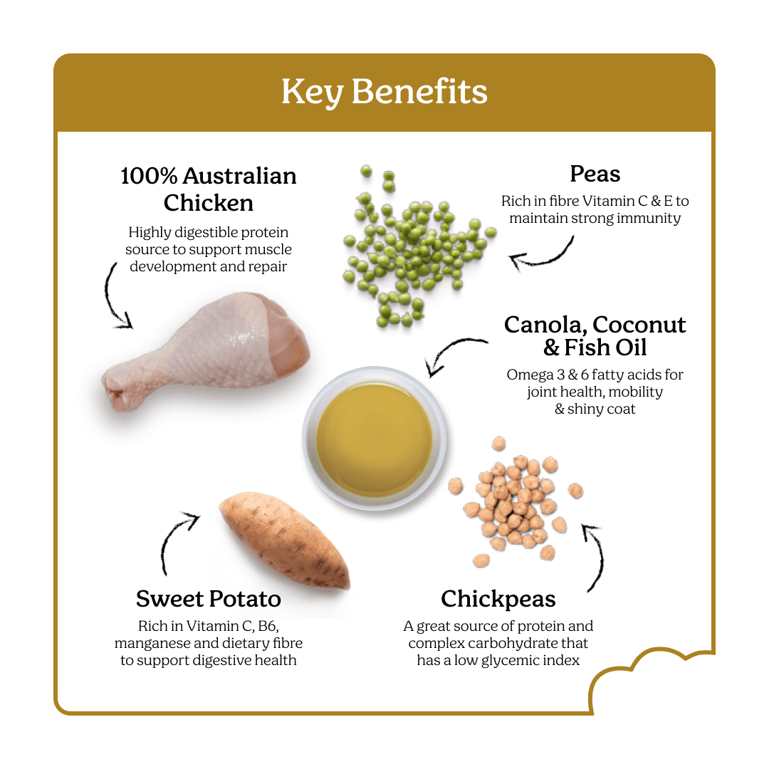 Australian Chicken Meal (Equiv. To 48%), Peas, Chickpeas, Faba Beans, Chicken Oil (With Mixed Tocopherols & Rosemary Extract), Chicken Digest, Sweet Potato, Vitamins & Minerals (Including Calcium, Phosphorus, Potassium, Sodium, Chloride, Magnesium, Iron, Copper, Manganese, Zinc, Iodine, Selenium, Vitamins A, C, D3, E, K, B1, B2, B3, B5, B6, B9, B12, Biotin, Choline), Canola Oil, Beet Pulp, Amino Acids (Methionine & Taurine), Coconut Oil, Fish Oil, Chicory Extract (Fos), Yucca Schidigera, D-Glucosamine, Chondroitin Sulphate.