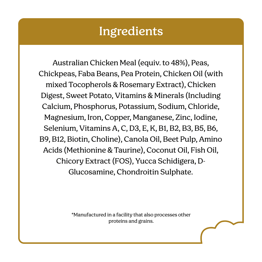 Australian Chicken Meal (Equiv. To 48%), Peas, Chickpeas, Faba Beans, Chicken Oil (With Mixed Tocopherols & Rosemary Extract), Chicken Digest, Sweet Potato, Vitamins & Minerals (Including Calcium, Phosphorus, Potassium, Sodium, Chloride, Magnesium, Iron, Copper, Manganese, Zinc, Iodine, Selenium, Vitamins A, C, D3, E, K, B1, B2, B3, B5, B6, B9, B12, Biotin, Choline), Canola Oil, Beet Pulp, Amino Acids (Methionine & Taurine), Coconut Oil, Fish Oil, Chicory Extract (Fos), Yucca Schidigera, D-Glucosamine, Chondroitin Sulphate.