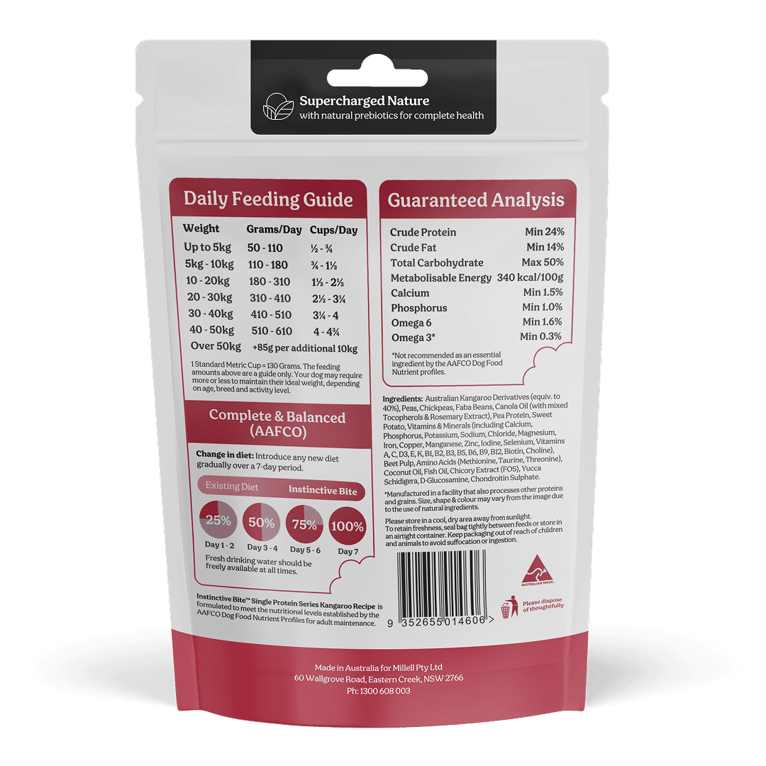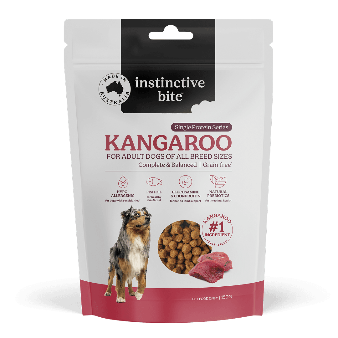 Instinctive Bite Single Protein Kangaroo is a high-quality lean protein, grain-free dog food made with premium Australian kangaroo meat. This nutrient-rich recipe is ideal for dogs with food sensitivities, offering a novel single-animal protein source that's both delicious and easy to digest. Formulated with pet nutritionists, it delivers a complete and balanced meal enhanced with natural prebiotics, glucosamine, and chondroitin to support digestive health, joint function and overall wellbeing. Kangaroo is naturally rich in vitamin B12 and a source of omega-3 fatty acids, making it a great choice for maintaining energy, muscle health and vitality. Your dog's health and wellbeing hinges on premium nutrition. At Instinctive Bite, we believe that a natural and holistic diet ensures that you're giving your dog the quality they deserve. Supercharged by nature our unique recipe of meats, superfoods, vegetables and natural prebiotics will keep your dog coming back.