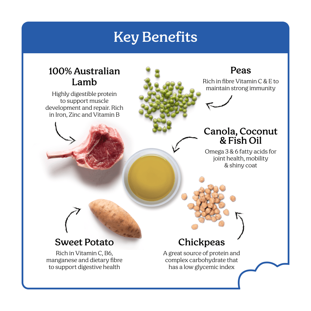 Australian Lamb Meal (Equiv. To 50%), Peas, Chickpeas, Potato Starch, Canola Oil (With Mixed Tocopherols & Rosemary Extract), Pea Protein, Non-Meat Digest, Sweet Potato, Vitamins & Minerals (Including Calcium, Phosphorus, Potassium, Sodium, Chloride, Magnesium, Iron, Copper, Manganese, Zinc, Iodine, Selenium, Vitamins A, C, D3, E, K, B1, B2, B3, B5, B6, B9, B12, Biotin, Choline), Beet Pulp, Amino Acids (Methionine, Taurine, Threonine), Coconut Oil, Fish Oil, Chicory Extract (Fos), Yucca Schidigera, D-Glucosamine, Chondroitin Sulphate.