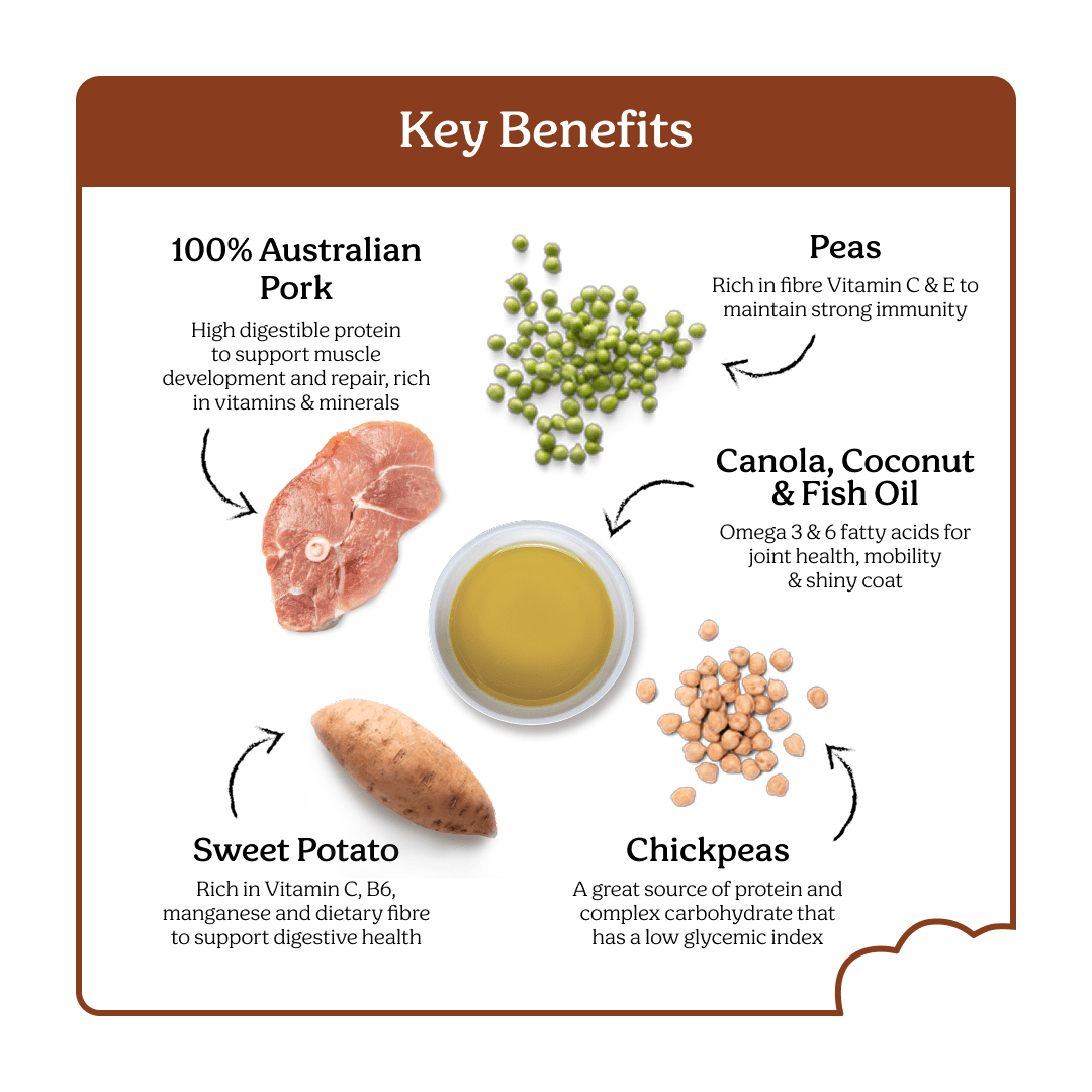 Australian Pork Meal (Equiv. To 55%), Peas, Chickpeas, Faba Beans, Canola Oil (With Mixed Tocopherols & Rosemary Extract), Non-Meat Digest,Sweet Potato, Vitamins & Minerals (Including Calcium, Phosphorus, Potassium, Sodium, Chloride, Magnesium, Iron, Copper, Manganese, Zinc, Iodine, Selenium, Vitamins A, C, D3, E, K, B1, B2, B3, B5, B6, B9, B12, Biotin, Choline), Beet Pulp, Amino Acids (Methionine, Taurine, Threonine), Coconut Oil, Fish Oil, Chicory Extract (Fos), Yucca Schidigera, D-Glucosamine, Chondroitin Sulphate.