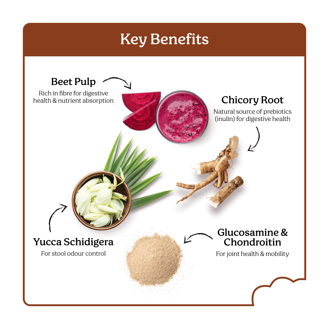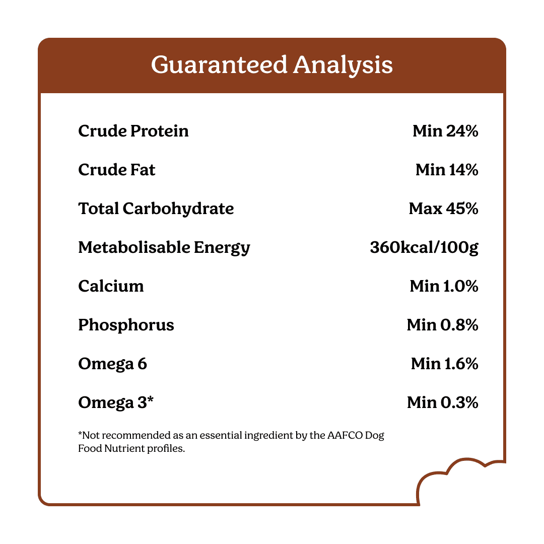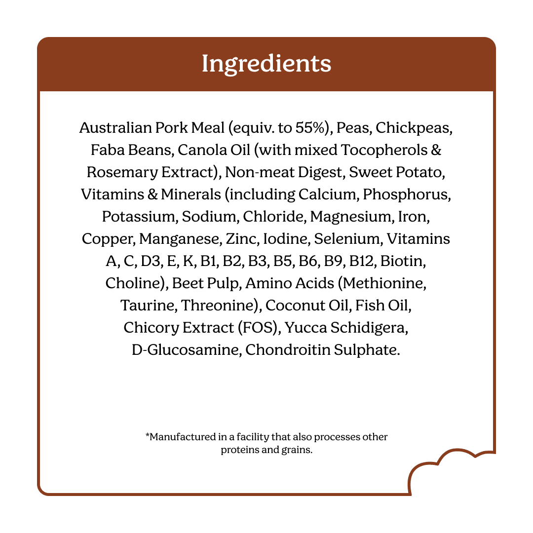 Australian Pork Meal (Equiv. To 55%), Peas, Chickpeas, Faba Beans, Canola Oil (With Mixed Tocopherols & Rosemary Extract), Non-Meat Digest,Sweet Potato, Vitamins & Minerals (Including Calcium, Phosphorus, Potassium, Sodium, Chloride, Magnesium, Iron, Copper, Manganese, Zinc, Iodine, Selenium, Vitamins A, C, D3, E, K, B1, B2, B3, B5, B6, B9, B12, Biotin, Choline), Beet Pulp, Amino Acids (Methionine, Taurine, Threonine), Coconut Oil, Fish Oil, Chicory Extract (Fos), Yucca Schidigera, D-Glucosamine, Chondroitin Sulphate.