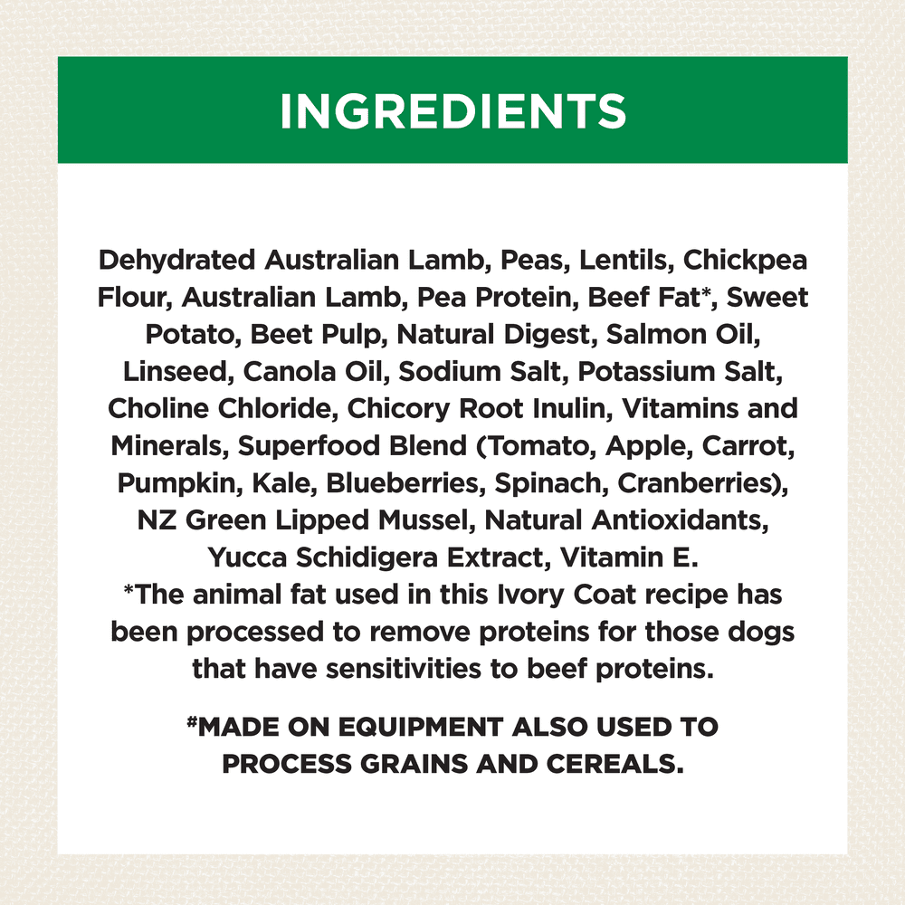 Dehydrated Australian Lamb, Peas, Lentils, Chickpea Flour, Australian Lamb, Pea Protein, Beef Fat*, Sweet Potato, Beet Pulp, Natural Digest, Salmon Oil, Linseed, Canola Oil, Sodium Salt, Potassium Salt, Choline Chloride, Chicory Root Inulin, Vitamins and Minerals, Superfood Blend (Tomato, Apple, Carrot, Pumpkin, Kale, Blueberries, Spinach, Cranberries), NZ Green Lipped Mussel, Natural Antioxidants, Yucca Schidigera Extract, Vitamin E.