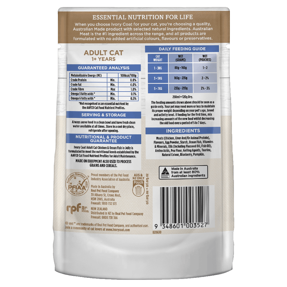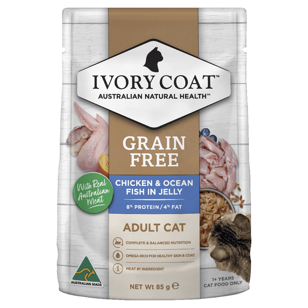 Ivory Coat Grain Free Adult Wet Cat Food Chicken and Ocean Fish in Jelly provides your cat with a delicious, highly nutritious meal tailored to meet their specific dietary needs as obligate carnivores. This grain-free recipe blends high-quality Australian meat with a range of natural superfoods to ensure your feline receives the best in protein, antioxidants, and essential nutrients.