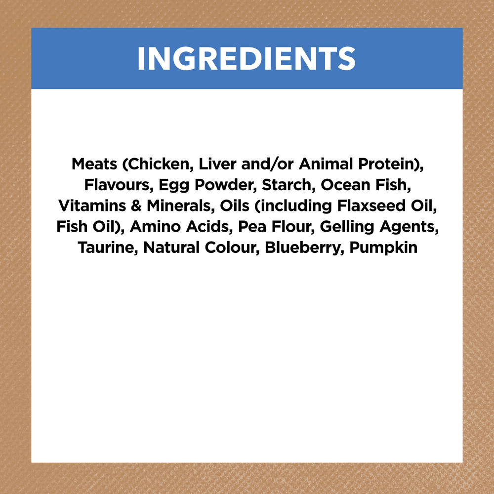 Chicken, Liver, Flavours, Egg powder, Starch, Ocean fish, Animal protein, Vitamins & Minerals, Amino acids, Sunflower oil, Pea flour, Gelling agents, Coconut oil, Flaxseed oil, Fish oil, Taurine, Natural colour (caramel), Blueberry, Pumpkin
