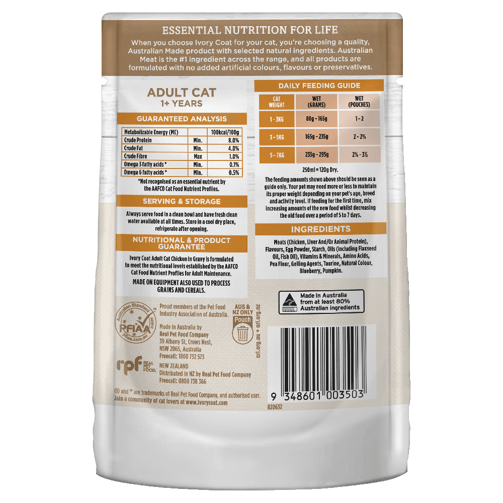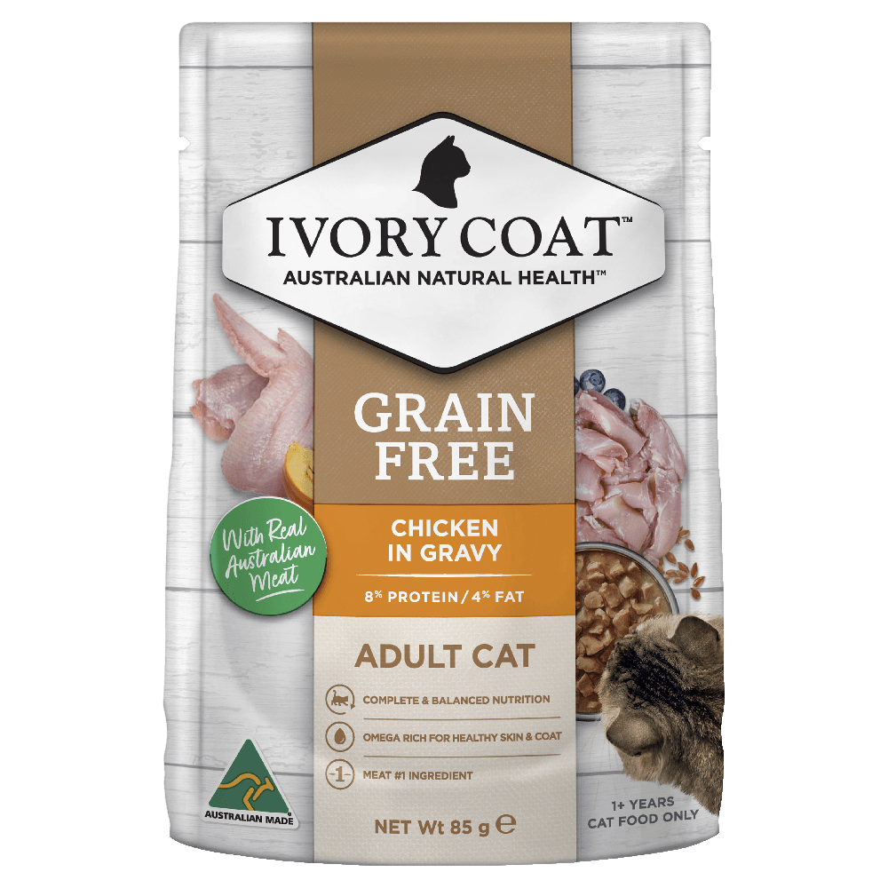 Ivory Coat Grain Free Adult Wet Cat Food Chicken in Gravy is a nourishing, flavorful meal designed to cater to the specific dietary needs of adult cats. This grain-free recipe combines premium Australian chicken with essential nutrients and antioxidants, providing a complete and balanced meal that promotes overall health, hydration, and well-being.