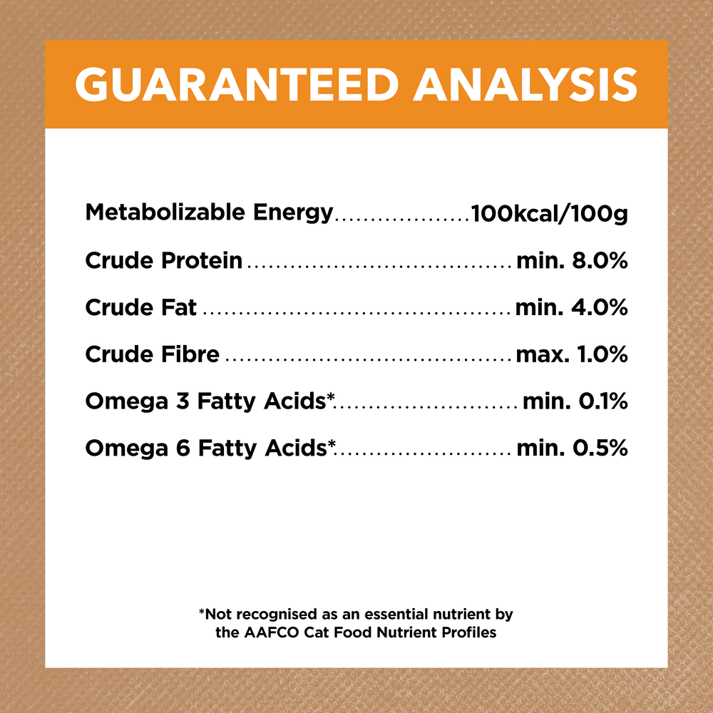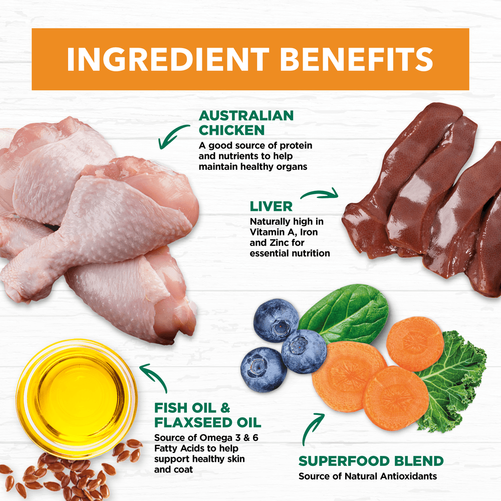 Chicken, Liver, Flavours, Egg powder, Starch, Animal protein, Vitamins & Minerals, Amino acids, Sunflower oil, Pea flour, Gelling agents, Coconut oil, Flaxseed oil, Fish oil, Taurine, Natural colour (caramel), Blueberry, Pumpkin,
