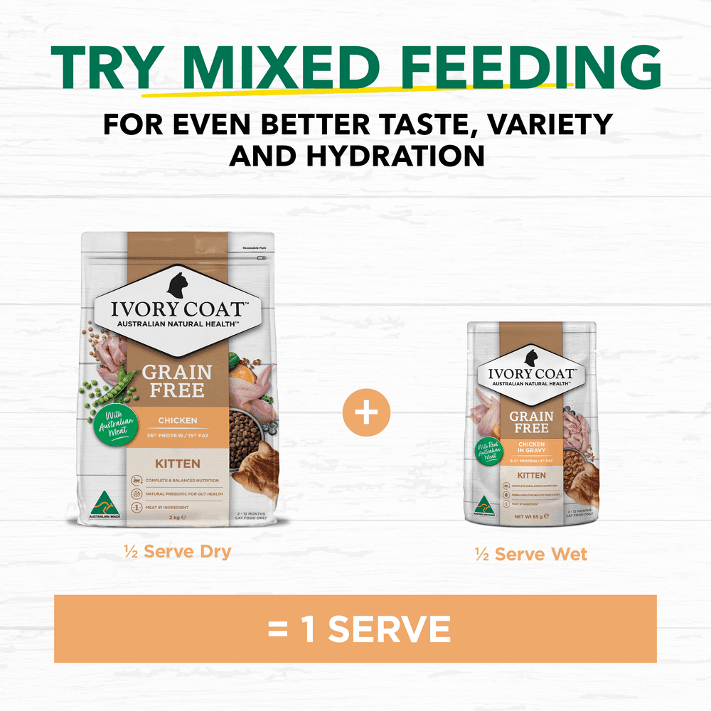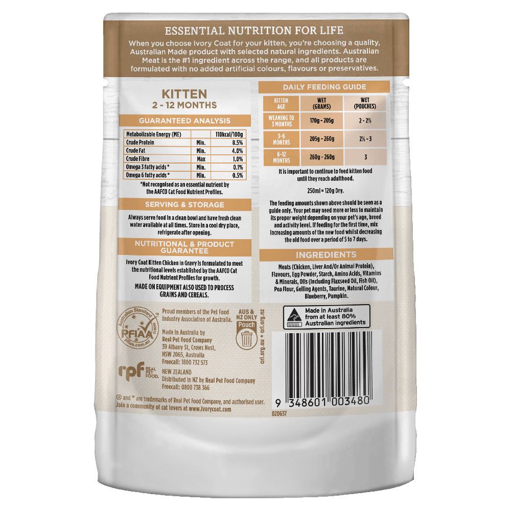 Ivory Coat Grain Free Kitten Chicken in Gravy Wet Food is crafted to provide the perfect balance of high-quality protein, healthy fats, and essential nutrients for growing kittens. With its grain-free formula and carefully selected natural ingredients, this food supports healthy growth, strong muscles, and a shiny coat, all while keeping your kitten hydrated and satisfied. Made with Australian meat as the #1 ingredient, this offers your kitten a tasty, nutritious meal that's specially designed to support their growth and development