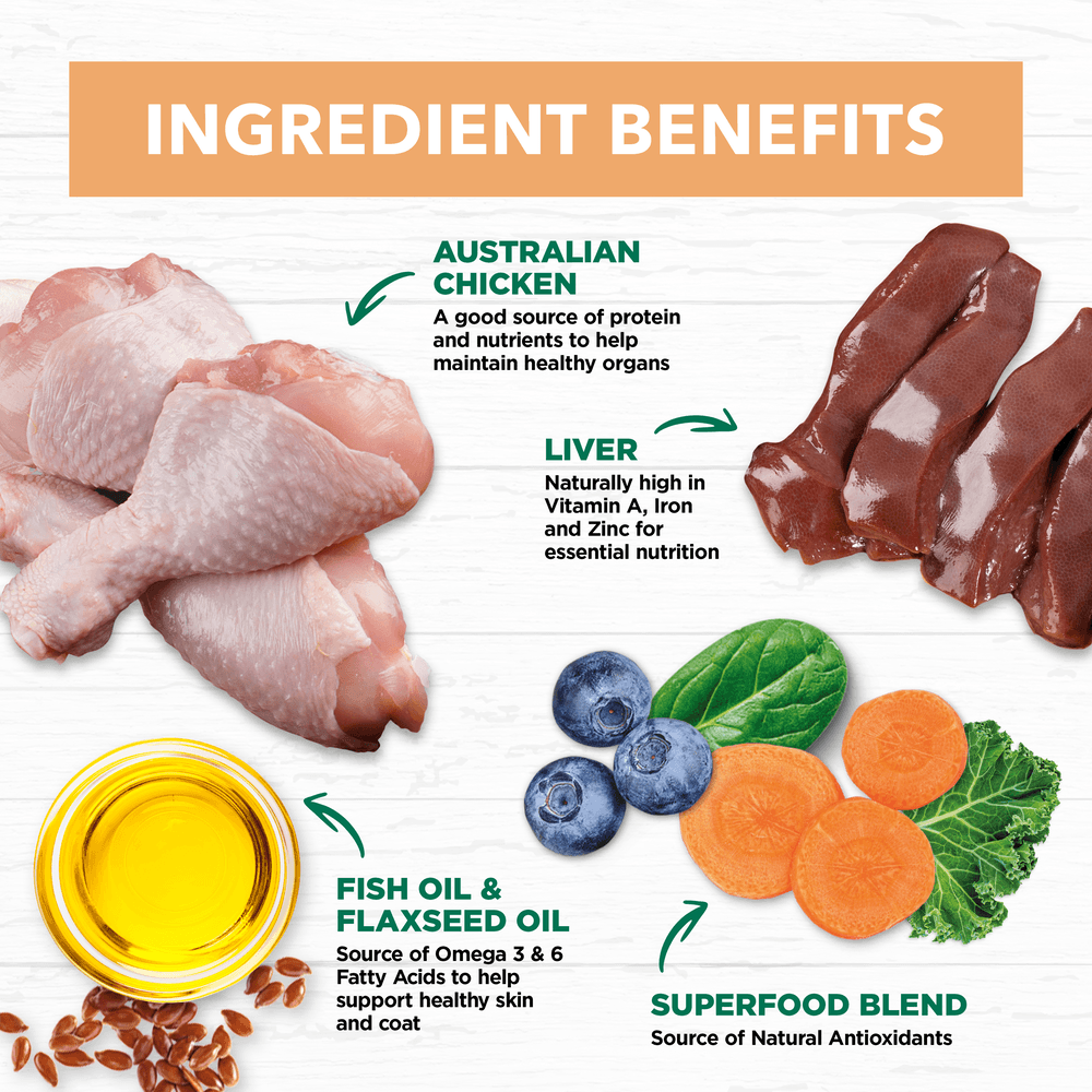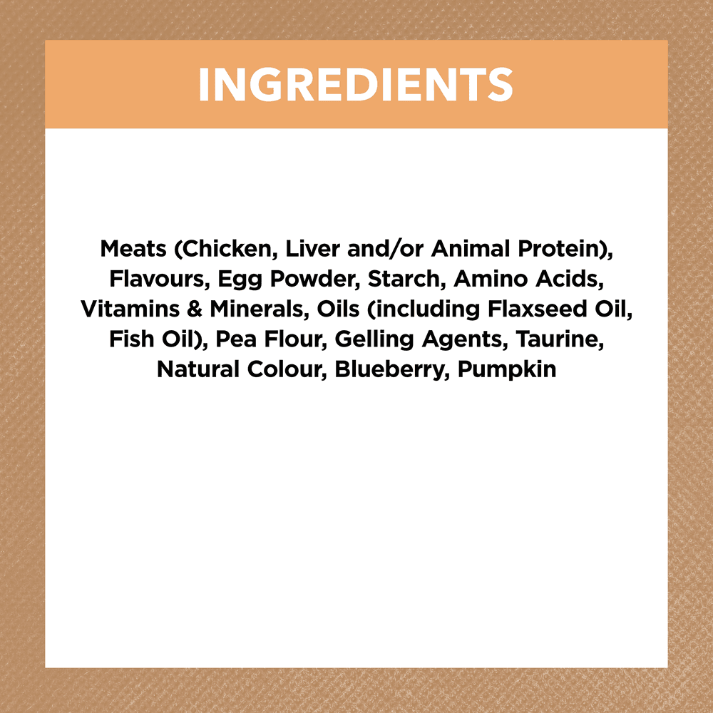 Chicken, Liver, Flavours, Egg powder, Starch, Amino acids, Animal protein, Vitamins & Minerals, Sunflower oil, Pea flour, Gelling agents, Coconut oil, Flaxseed oil, Fish oil, Taurine, Natural colour (caramel), Blueberry, Pumpkin