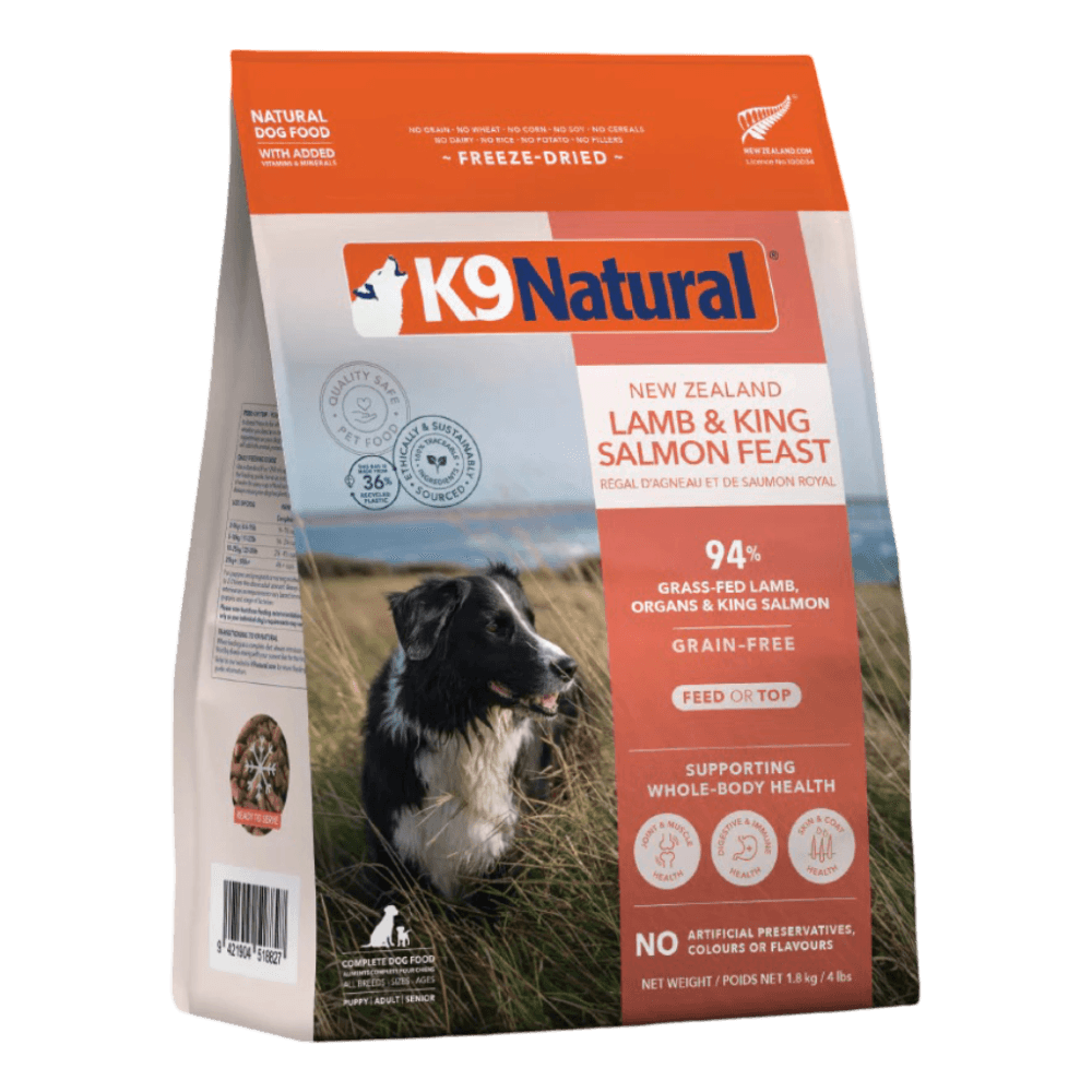 K9 Natural Lamb and King Salmon Grain-Free Freeze-Dried Dog Food offers a premium, high-protein, nutrient-packed meal made with premium grass-fed lamb and sustainably sourced king salmon. This delicious combination of land and sea proteins is carefully freeze-dried to retain its natural flavour and nutritional value. Ideal for dogs with food sensitivities, this formula provides a grain-free, gluten-free diet that supports optimal health, muscle development, and a shiny coat.