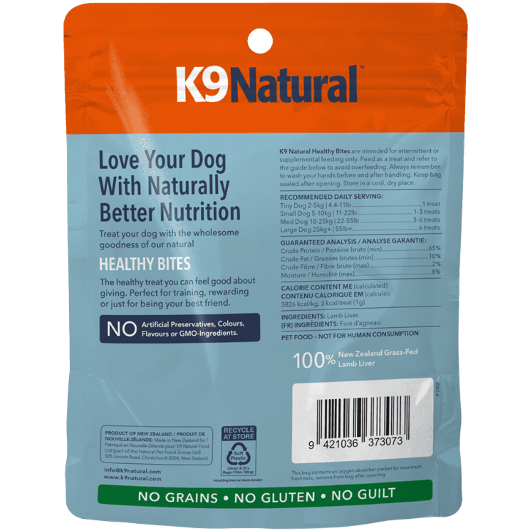 - The lightweight and mess-free texture makes the K9 Natural Lamb Liver Bites Grain Free Freeze Dried Dog Treats an ideal high-reward option for training sessions