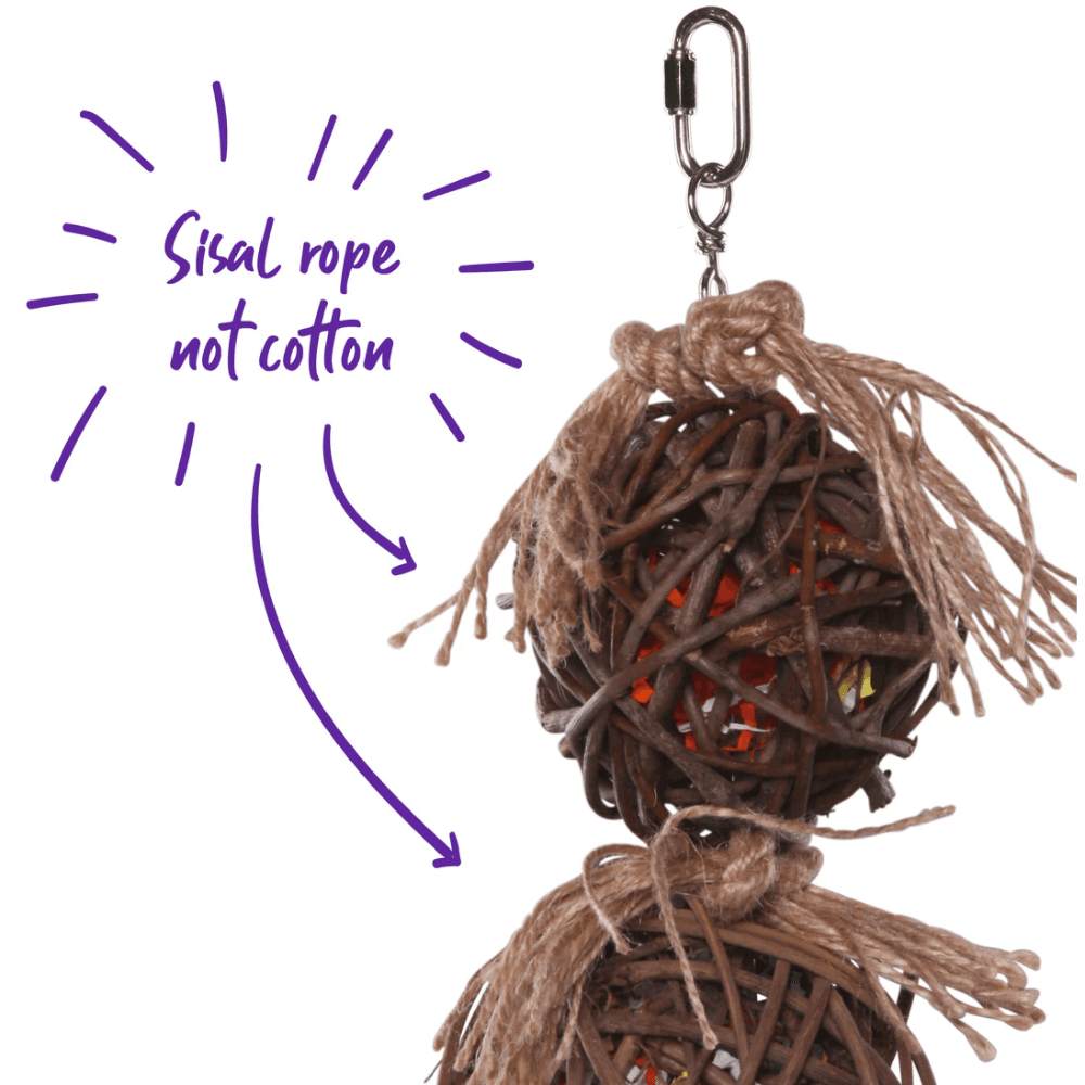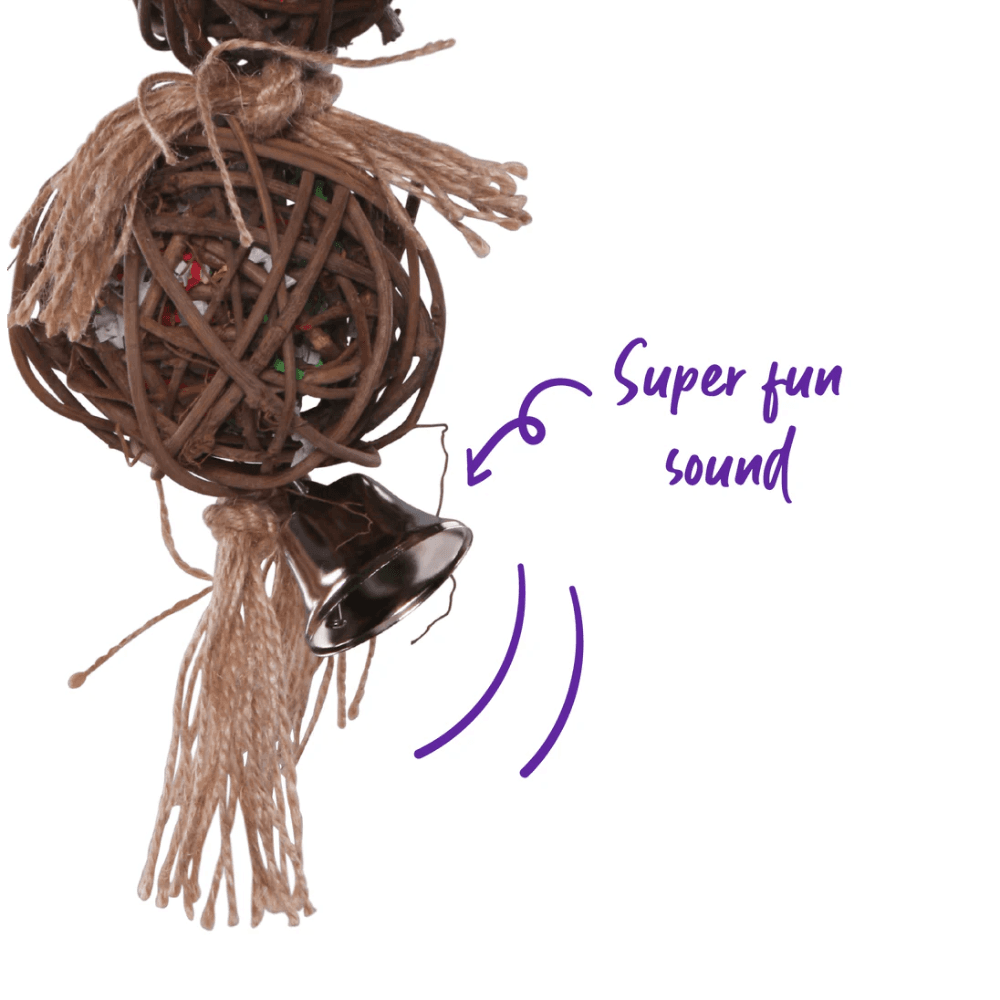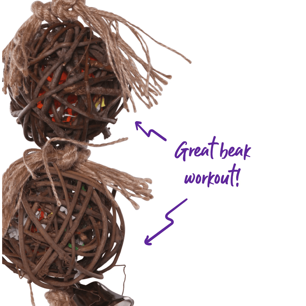 The Kazoo Bird Toy 2 Piece Stacked Wicker Ball with Bell is an engaging accessory for birds. Featuring two natural wicker balls with an integrated bell, it satisfies chewing and shredding instincts while providing auditory stimulation. Easy to hang, this toy helps alleviate boredom and promotes beak health in your feathered friend.