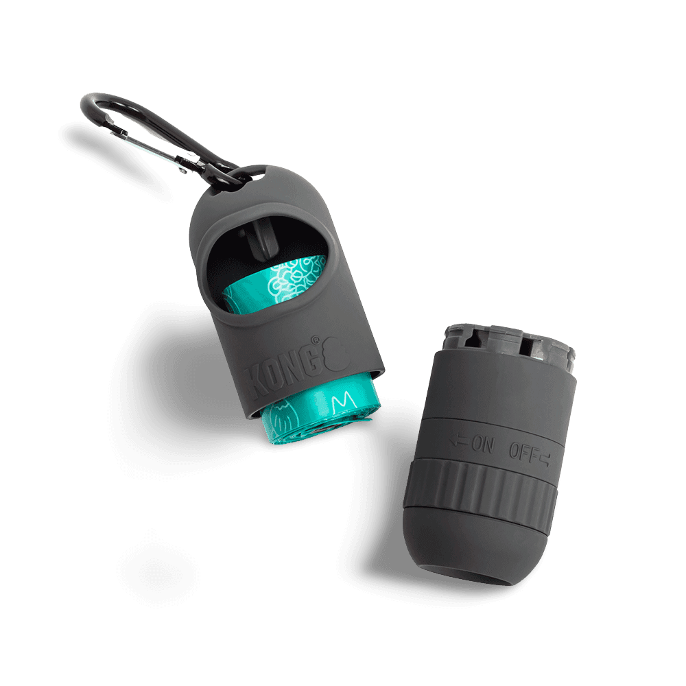 The KONG Handipod Mini Interchangeable Starter Kit is designed for dog walkers or pet parents who want to be prepared for anything when out the house. The pack contains interchangeable components, such as a poop bag dispenser, a torch attachment, and a hand sanitising gel attachment
