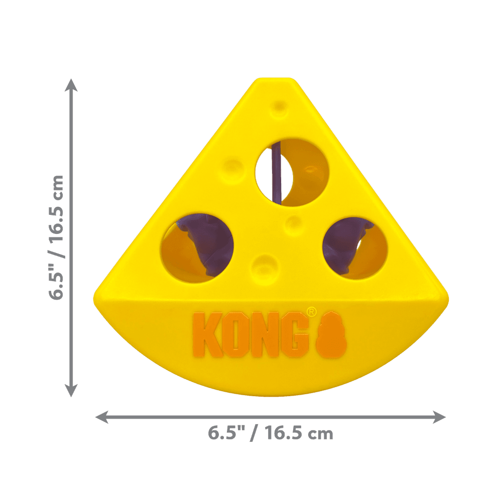 The KONG Scampers Rewards Rocker Cheese Treat Dispensing Cat Toy is an interactive toy designed to stimulate your cat's natural hunting instincts. This unique cheese-shaped rocker wobbles and rolls, dispensing treats as your feline friend plays, providing both mental stimulation and a tasty reward.