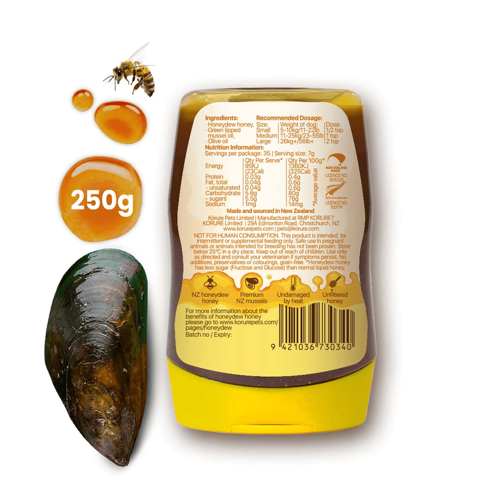Korure Pets Honey Mussel Oil Dog Oral Liquid is a natural canine supplement formulated to support joint health and immunity in dogs of all ages. This nutrient-rich topper combines high-quality New Zealand honeydew honey with green-lipped mussel oil to create a palatable liquid that enhances daily meals.