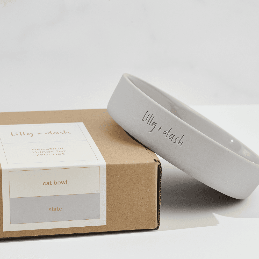 Lilly + Dash Minimalist Slate Ceramic Cat Bowl Crafted with a blend of style and practicality, the Lilly + Dash minimalist cat bowl is meticulously designed from ceramic, featuring a raw exterior and a hand-glazed, easy-to-clean gloss interior. Ideal for both food and water, this bowl offers durability and a naturally cool surface that keeps your cats meals fresh for longer periods.