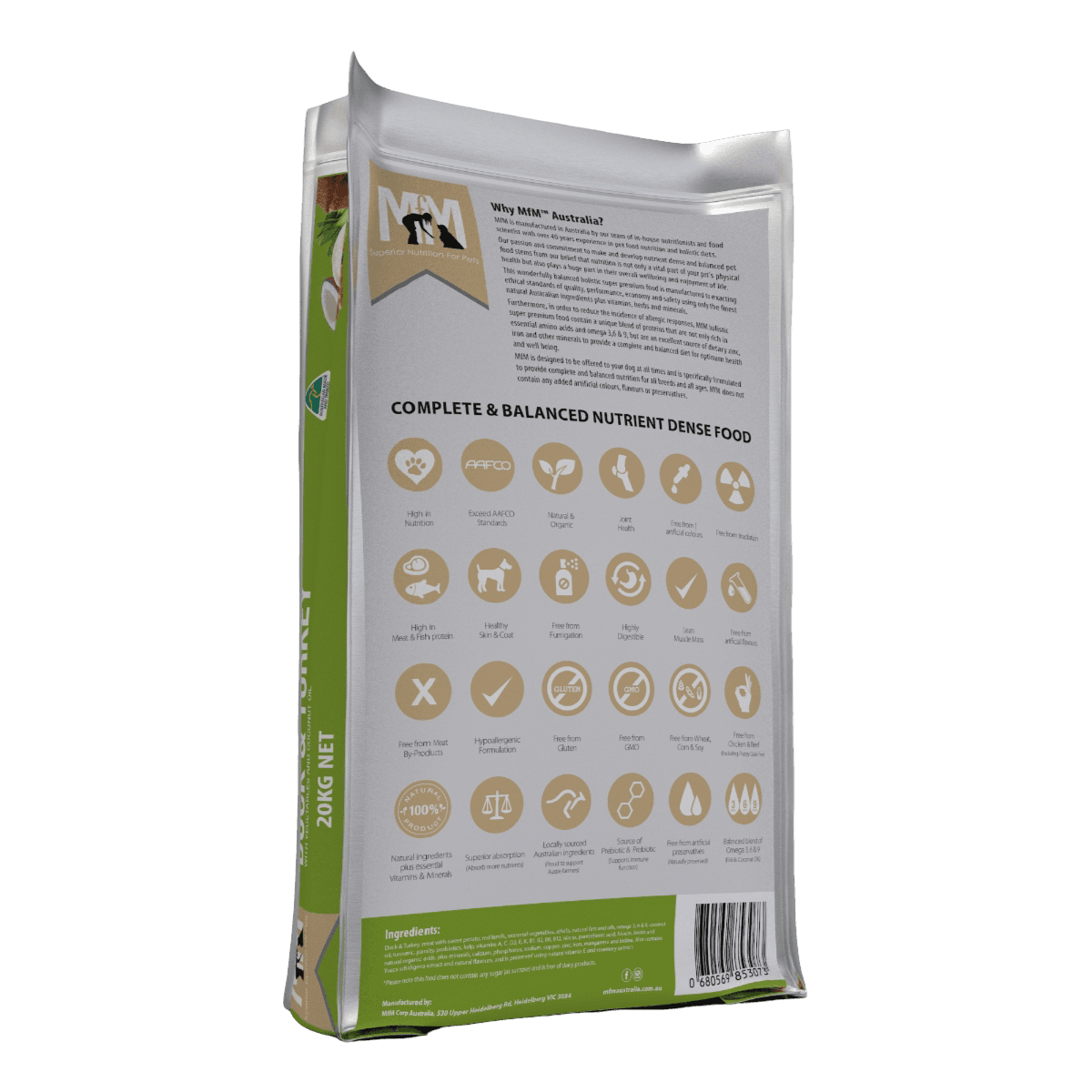 Meals For Mutts Duck & Turkey Grain Free All Lifestages Dry Dog Food is an Australian-made, grain-free holistic diet formulated for dogs of all breeds and ages to support overall health. This hypoallergenic recipe features nutrient-dense duck and turkey as primary protein sources to provide essential vitamins and minerals for energy production while remaining completely free from grain, gluten and dairy.