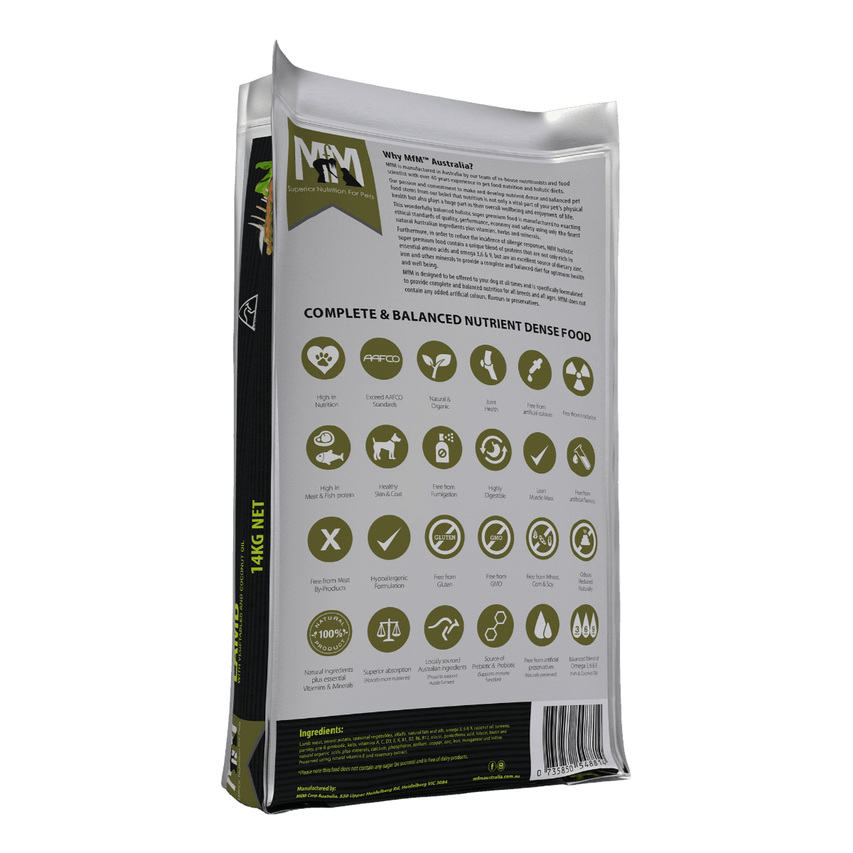 Meals For Mutts Single Protein Lamb Grain Free All Lifestages Dry Dog Food provides a holistic and hypoallergenic nutritional solution formulated for dogs of all breeds and ages. This Australian-made diet features pasture-fed lamb as an anti-inflammatory protein source to support heart health and optimal digestion without the use of grains, gluten, or meat by-products.