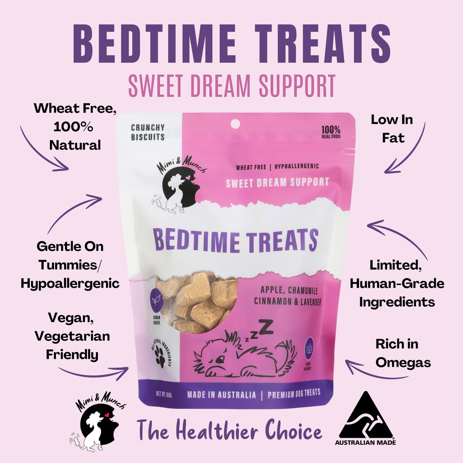 Mimi & Munch Wheat-Free Natural Bedtime Dog Treats are a calming and delicious way to end your dog's day. Made with natural, gentle ingredients like chamomile and lavender, these treats support sweet dreams and promote relaxation.
