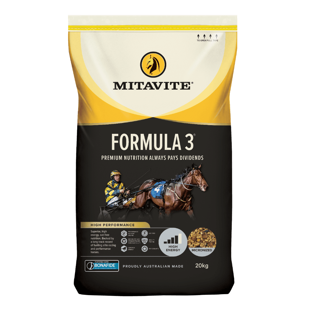 The Mitavite Formula 3 Horse Food is a superior, high-energy, oat-free muesli feed scientifically formulated for elite racing and performance horses. Its advanced nutrient profile delivers fast-release energy while providing comprehensive support for muscle health, recovery, and overall wellbeing.