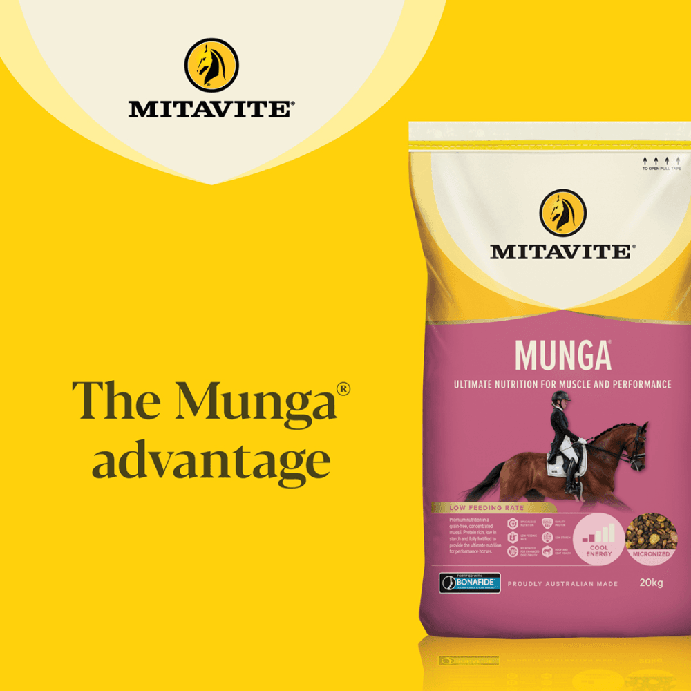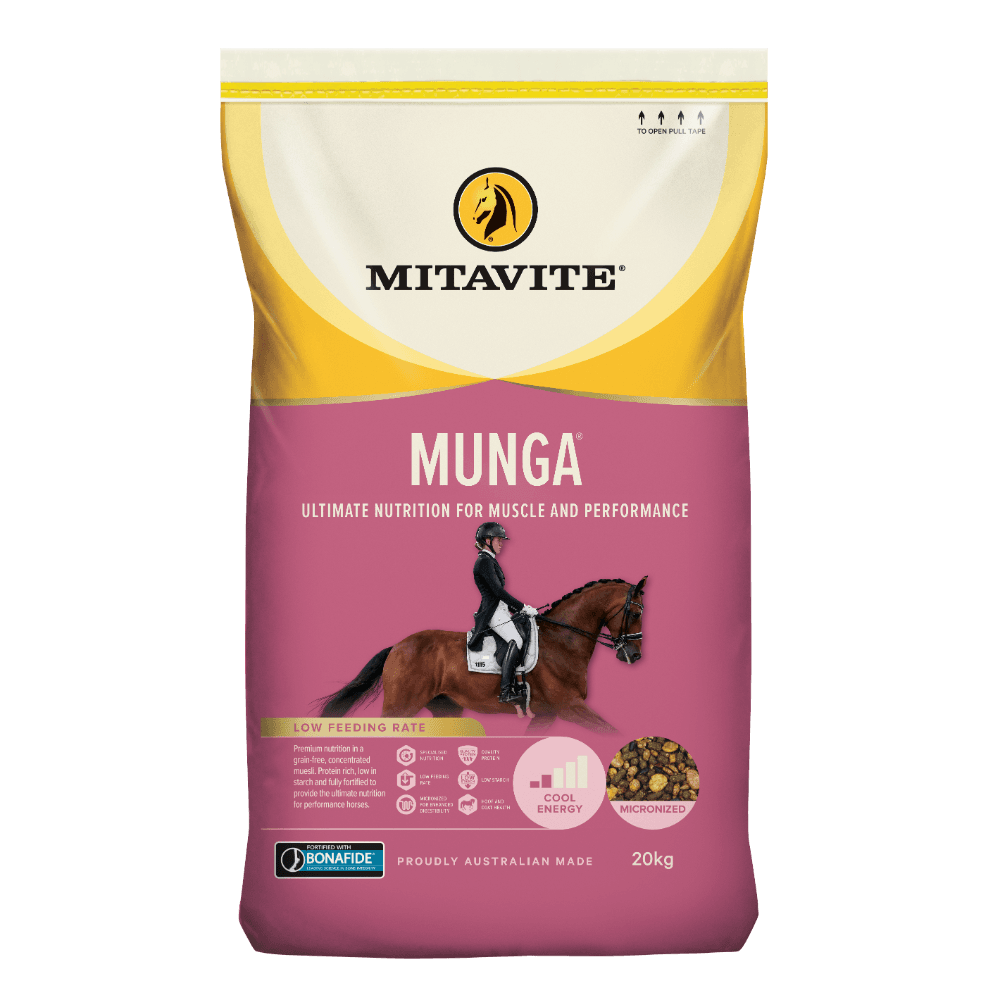 Mitavite Munga Horse Food is a grain-free, low-starch muesli concentrate designed to provide cool energy and support the nutritional needs of performance horses. This nutrient-rich formula promotes lean muscle development and assists in recovery, making it an ideal choice for training, competition, and post-illness care.