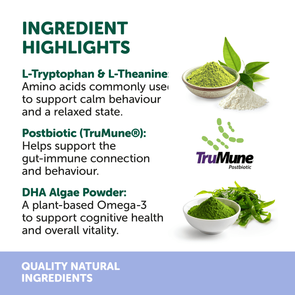 - Includes L-Tryptophan and L-Theanine, which are amino acids commonly used to support calm behaviour and a relaxed state