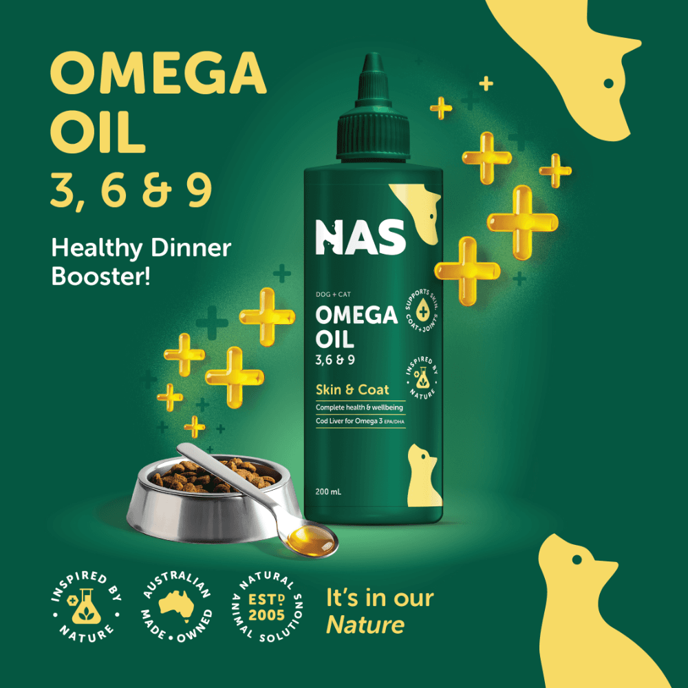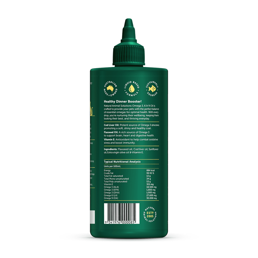 Natural Animal Solutions Omega 3, 6, 9 Oil is a premium supplement designed to boost your pets skin health, joint function, and overall well-being. Rich in essential omega fatty acids, this formula nourishes your pet from the inside out, promoting a shiny coat, healthy joints, and improved vitality.
