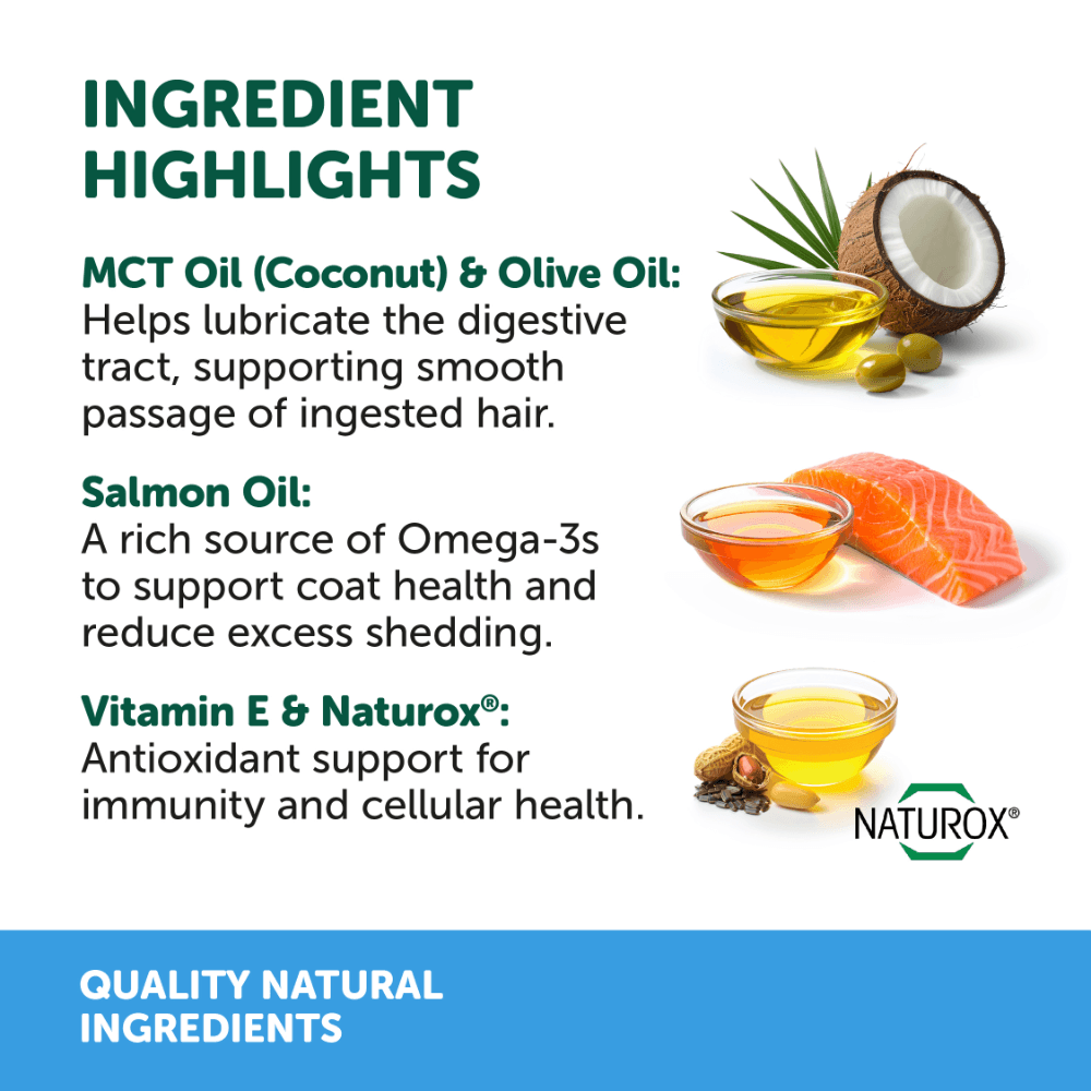 - Formulated with MCT Oil and Olive Oil to help lubricate the digestive tract for the smooth passage of ingested hair